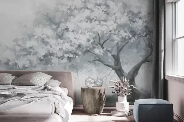 Murais de parede Árvore abstrata de flores azuis silenciosas em plena floração, junto a um rio, com pinceladas de textura suave e cores pastel Nr. w09193v2