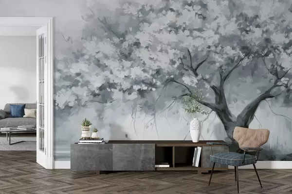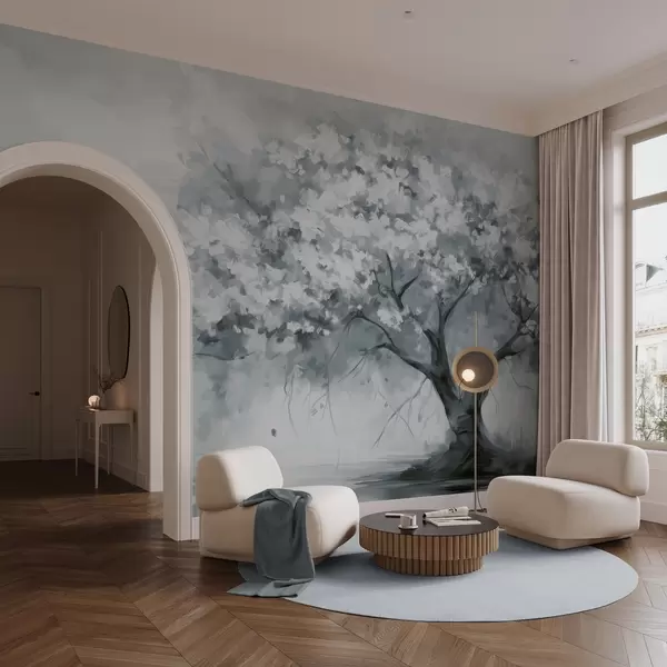 Murais de parede Árvore abstrata de flores azuis silenciosas em plena floração, junto a um rio, com pinceladas de textura suave e cores pastel Nr. w09193v2