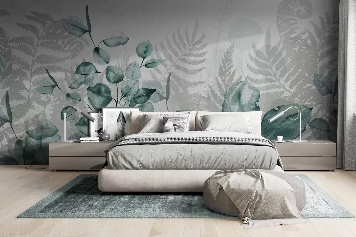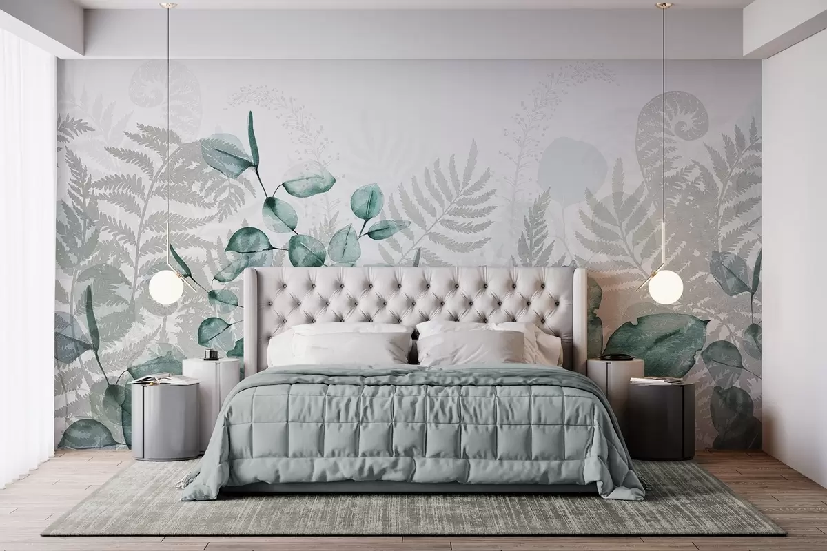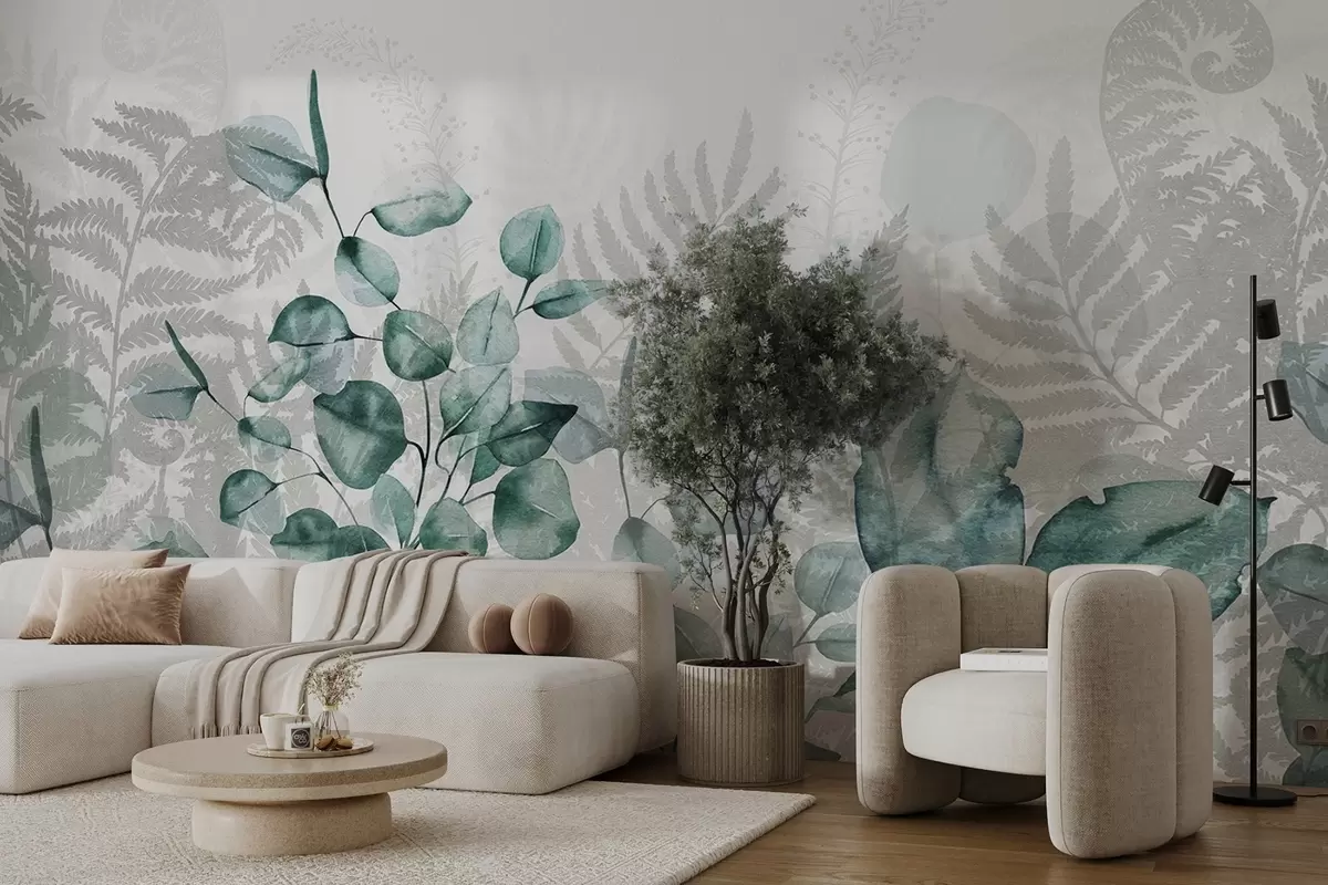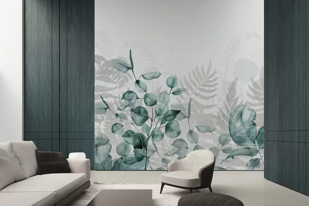 Murais de parede Folhas de eucalipto e de feto em tons de verde e cinzento, efeito aguarela, ilustração botânica Nr. w09197