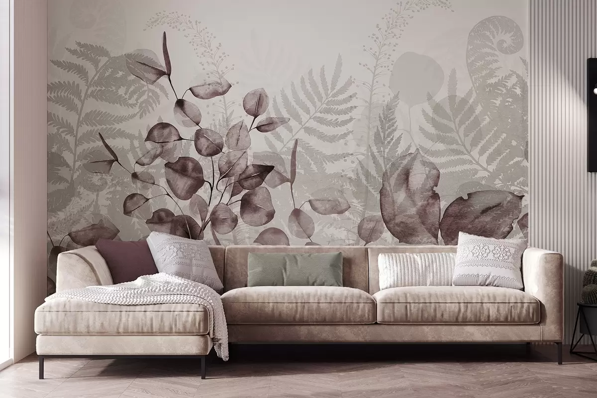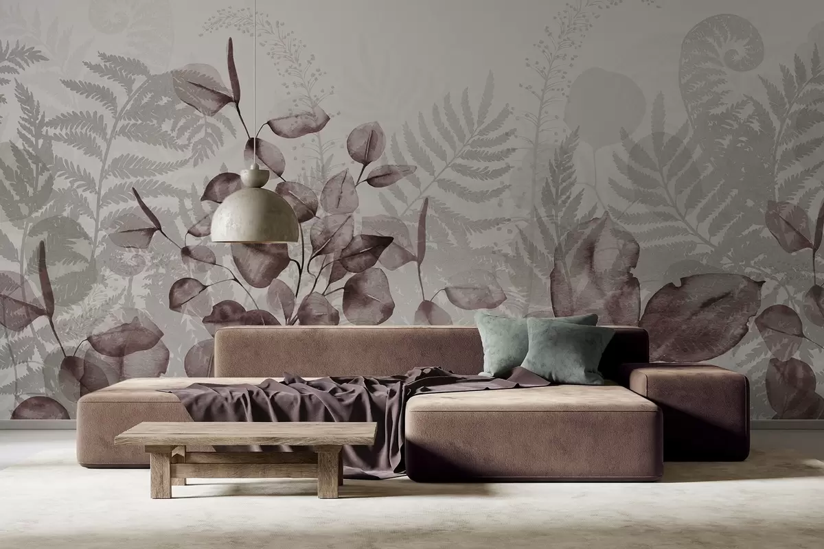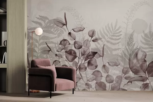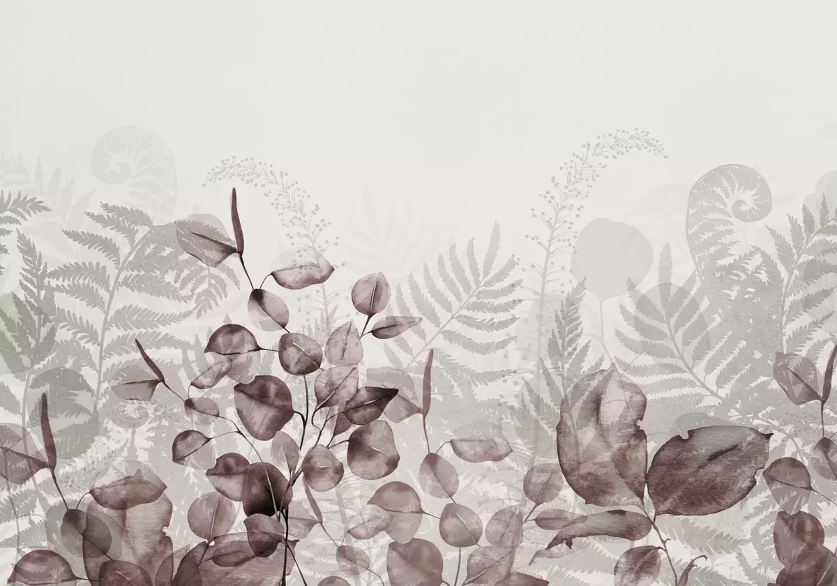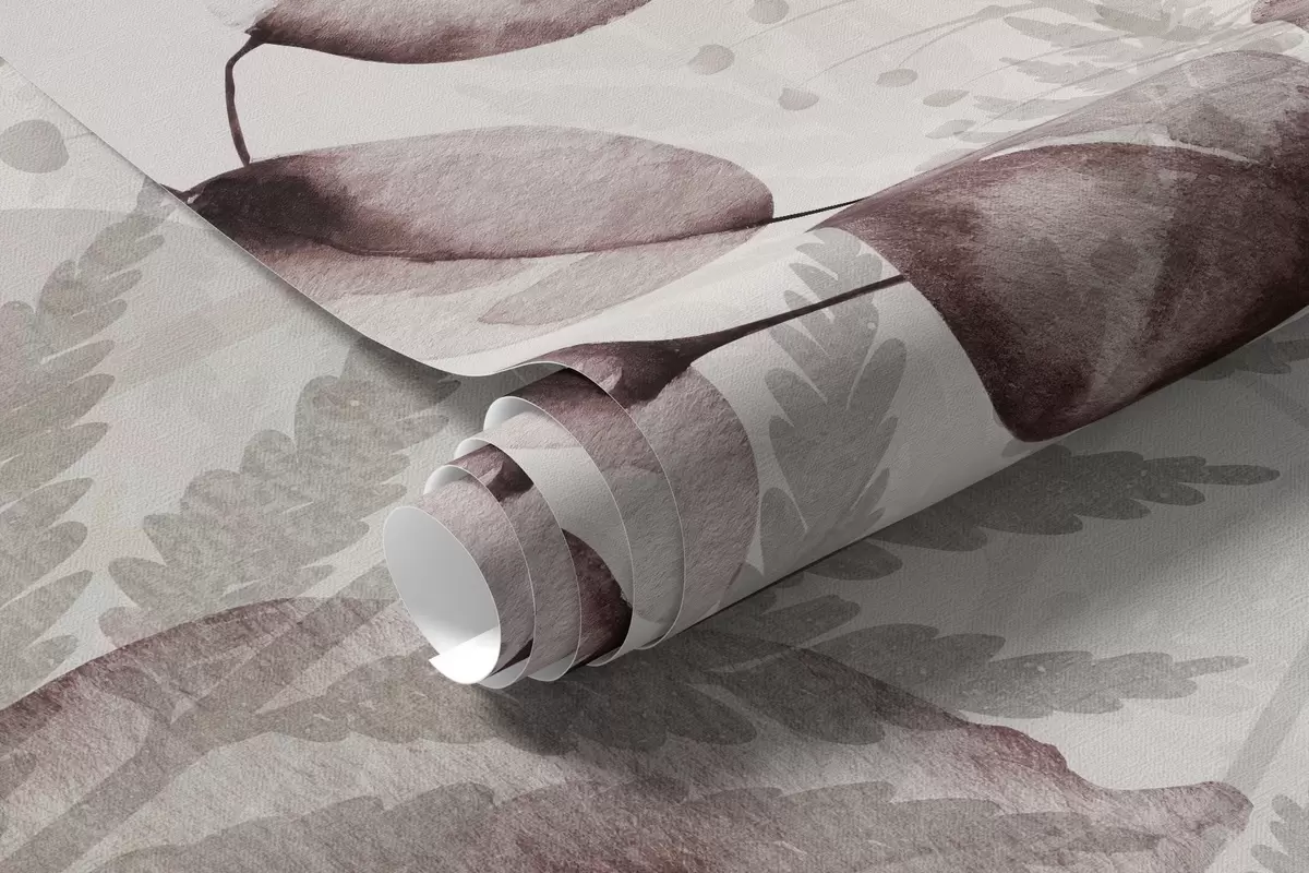 Murais de parede Folhas de eucalipto e de feto em tons de bordo e cinzento, efeito aguarela, ilustração botânica Nr. w09197v1