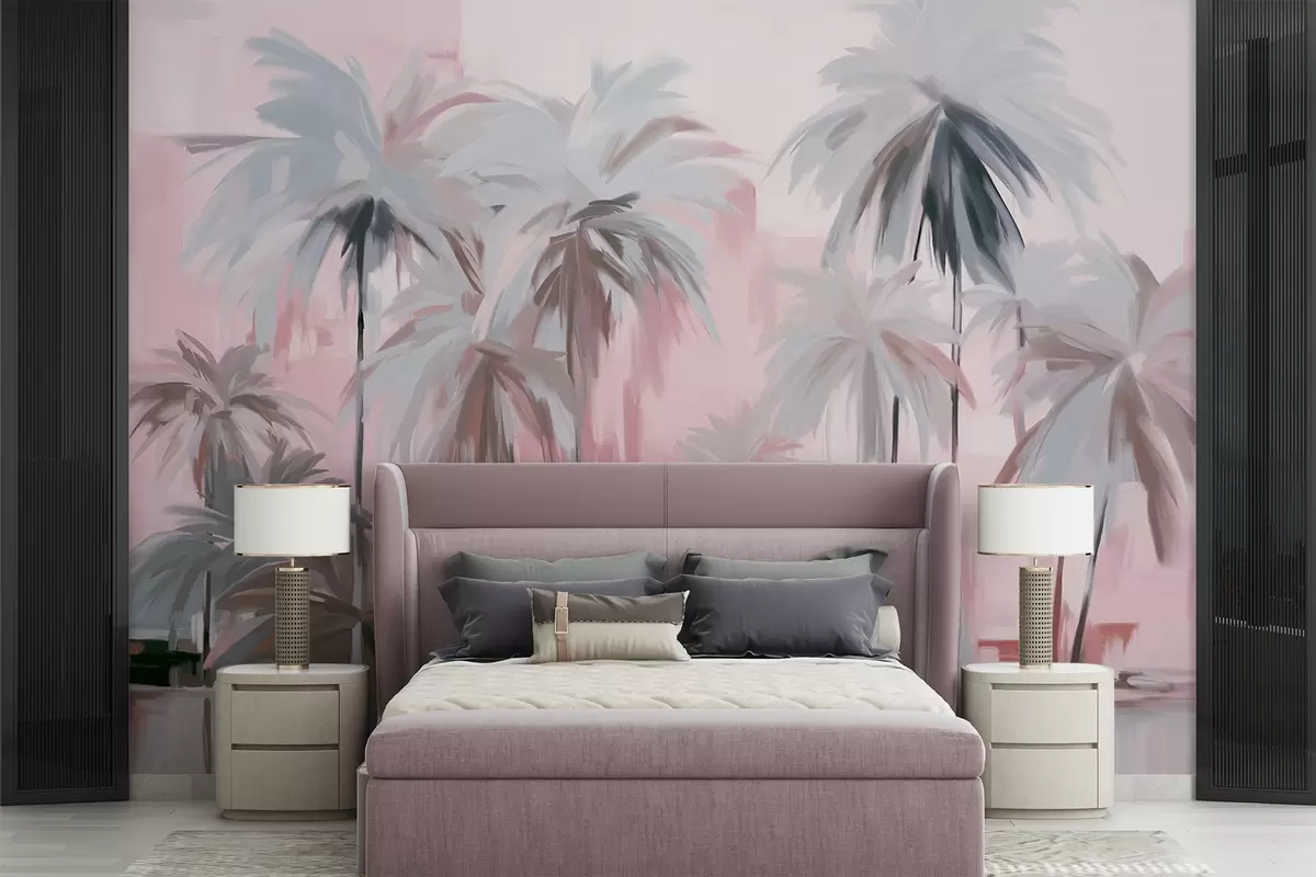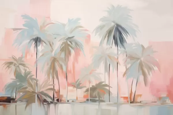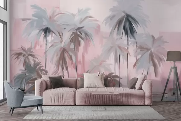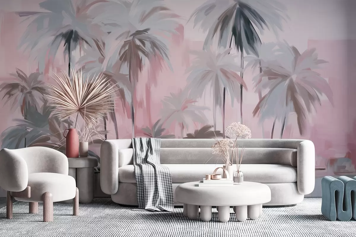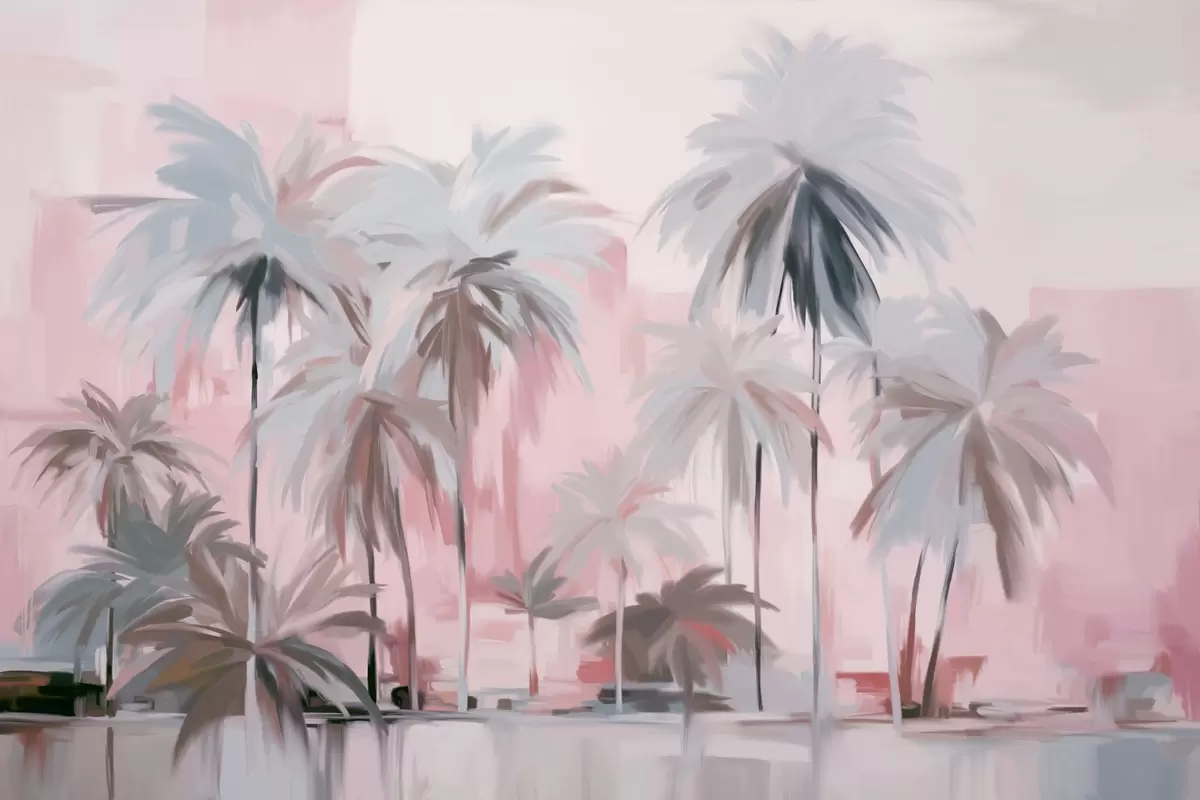 Murais de parede Palmeiras tropicais abstractas minimalistas em tons pastel, sobre um fundo de tons suaves de rosa e cinzento Nr. w09212v1