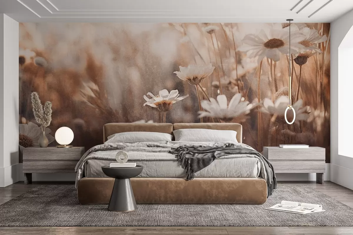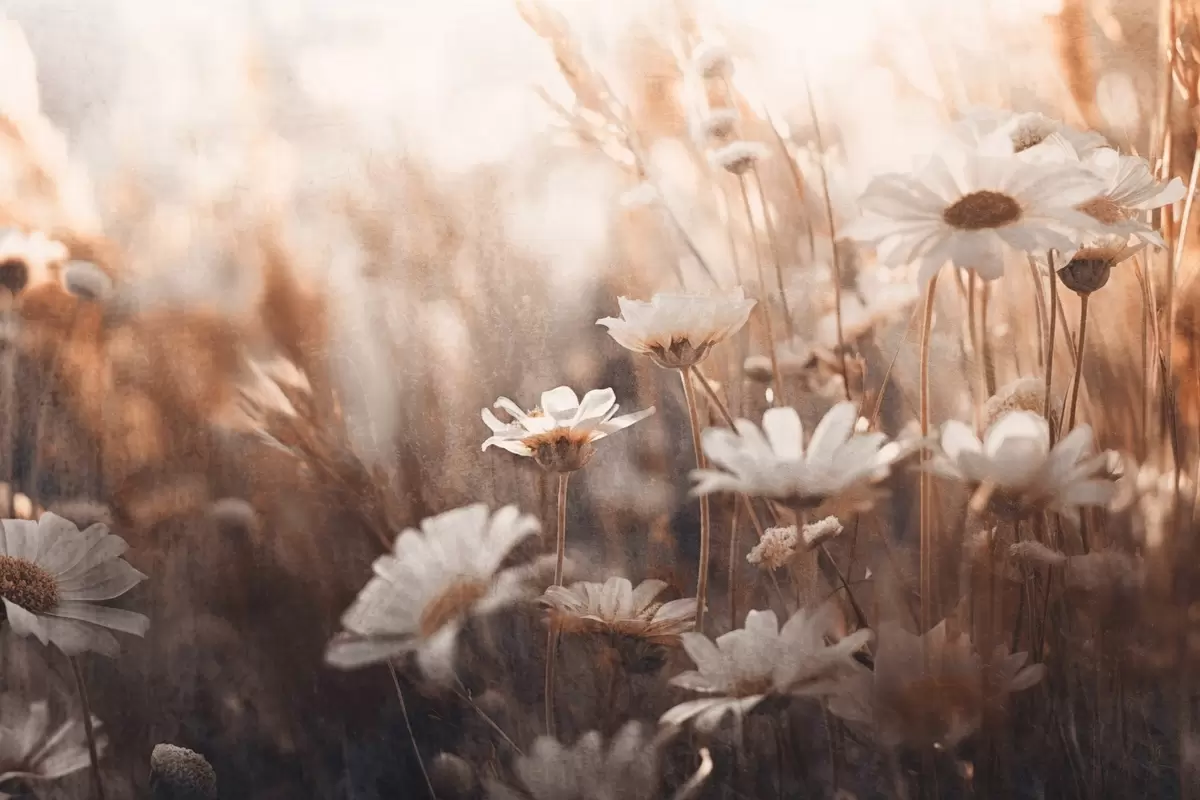 Murais de parede Campo texturado de margaridas brancas e flores silvestres numa paleta de cores quentes com fundo desfocado Nr. w09214