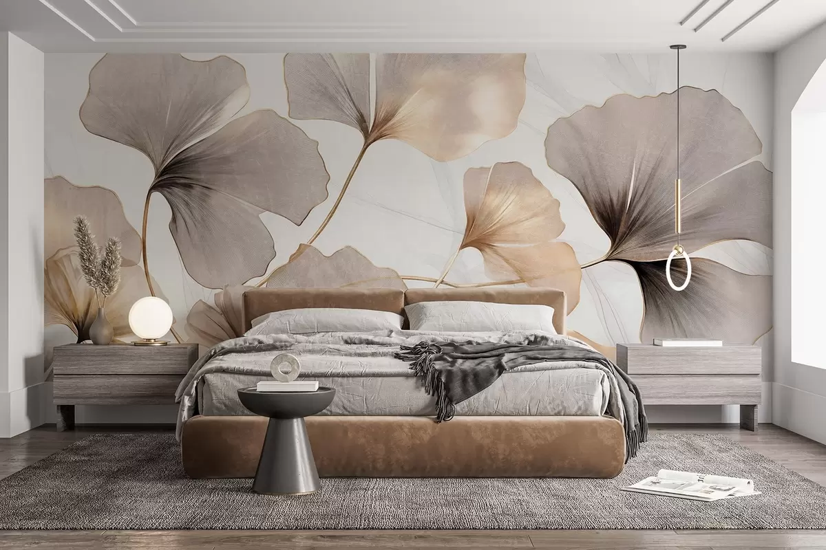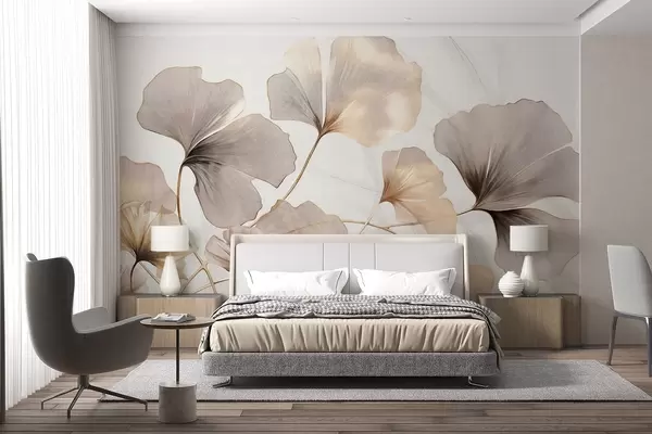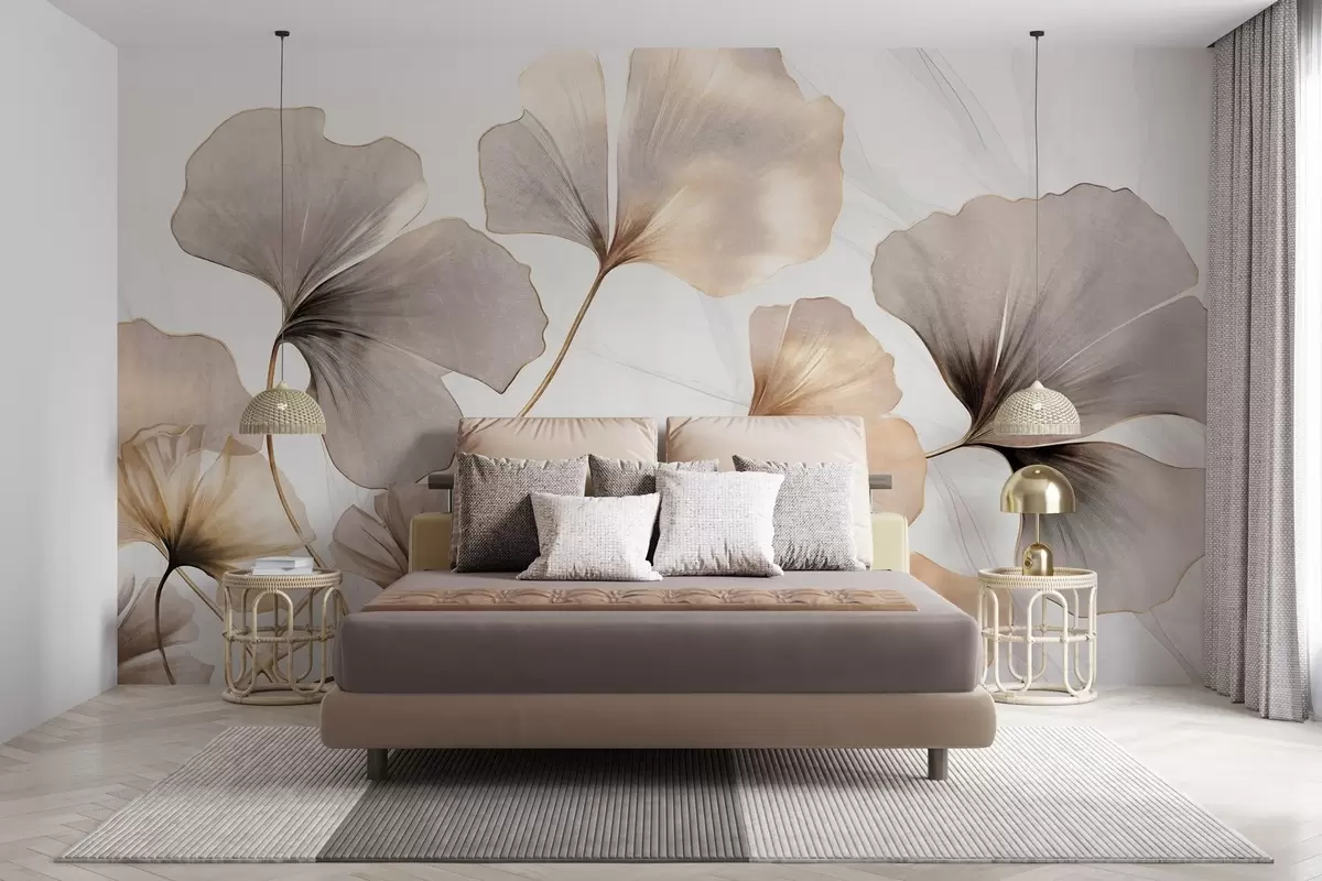 Murais de parede Folhas de Ginkgo biloba em tons de bege, amarelo e castanho, efeito de aguarela com textura delicada, fundo claro Nr. w09215