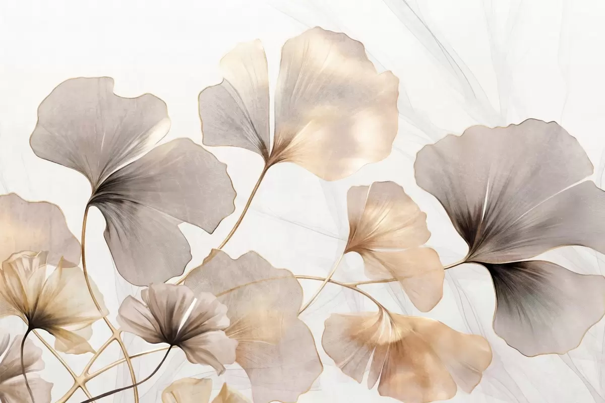 Murais de parede Folhas de Ginkgo biloba em tons de bege, amarelo e castanho, efeito de aguarela com textura delicada, fundo claro Nr. w09215