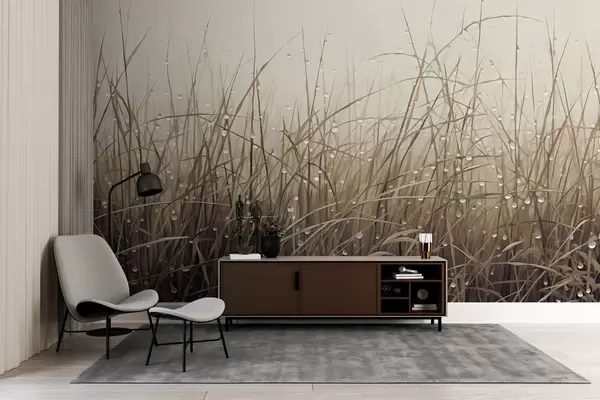 Murais de parede Relva com gotas de água, tons castanhos suaves, luz suave, fundo enevoado, estilo abstrato minimalista texturado Nr. w09217v1