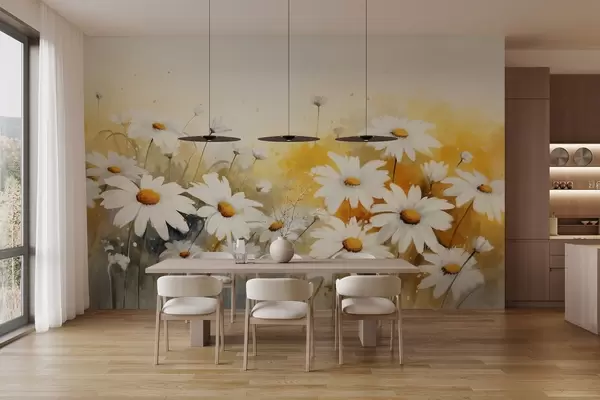 Murais de parede Um campo de margaridas brancas com centros amarelos, sobre um fundo amarelo e bege suave, estilo aguarela Nr. w09218
