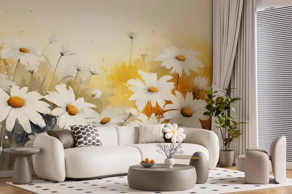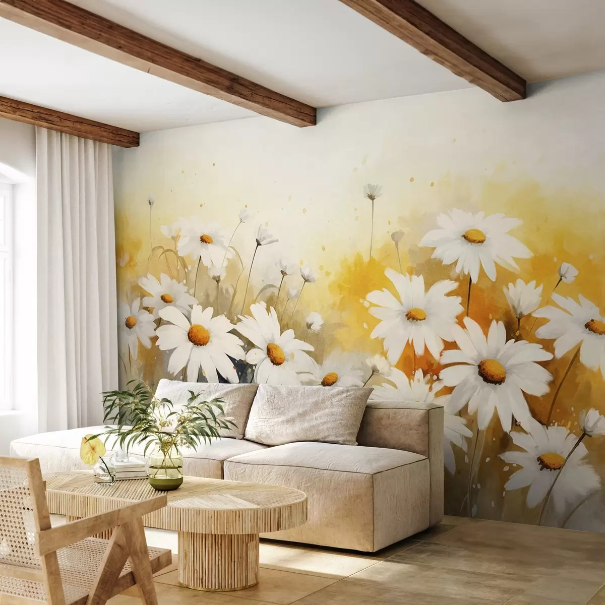 Murais de parede Um campo de margaridas brancas com centros amarelos, sobre um fundo amarelo e bege suave, estilo aguarela Nr. w09218
