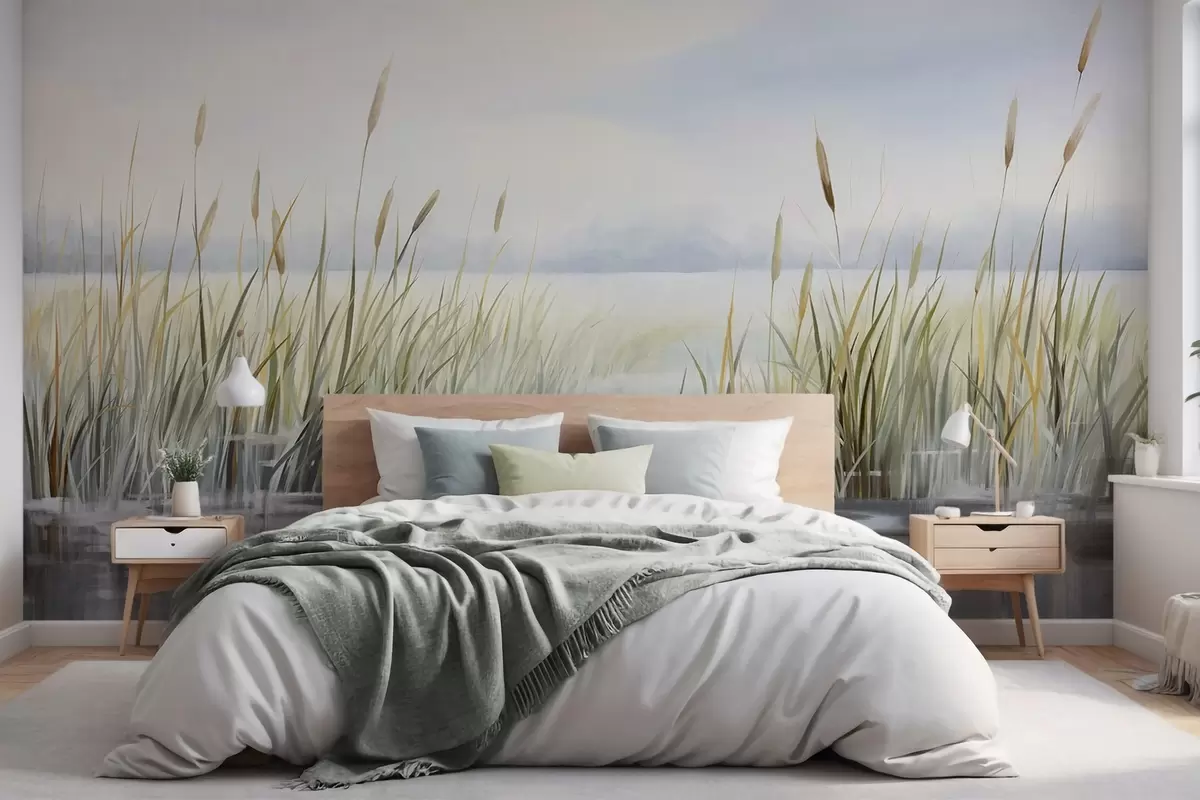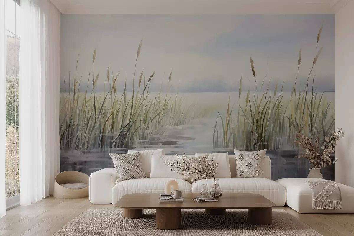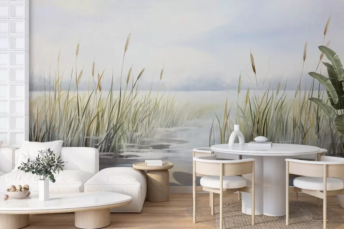 Murais de parede Pintura com textura de aguarela imitando uma paisagem com lago, relva, céu nublado e fundo desfocado Nr. w09219