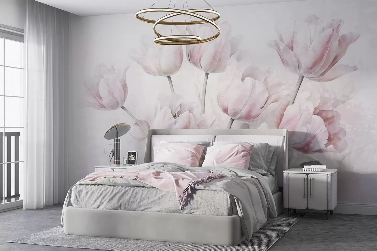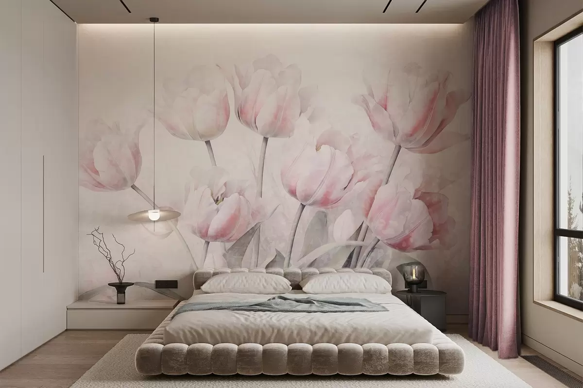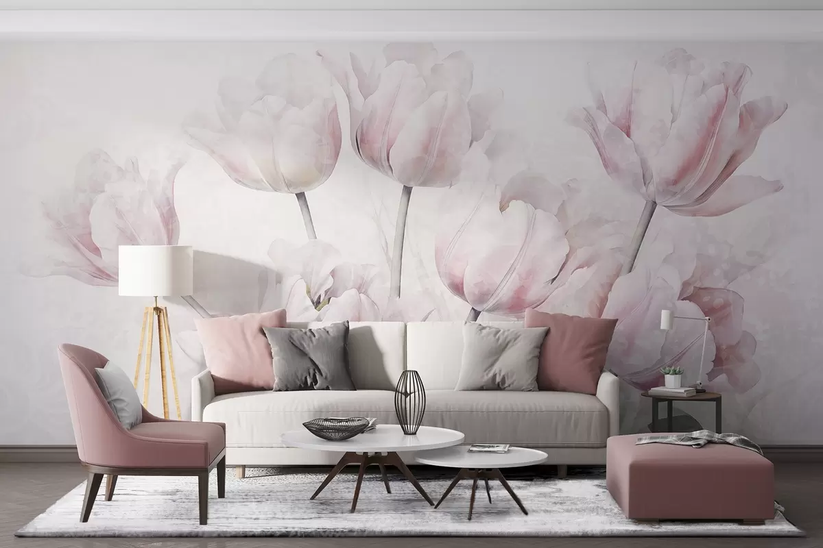 Murais de parede Tulipas cor-de-rosa texturadas com folhas verdes, luz suave, estilo aguarela vintage, pinceladas delicadas Nr. w09220