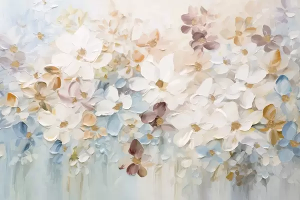 Murais de parede Pintura a óleo imitação de um jardim de flores com flores brancas, azuis e cor de laranja, pinceladas suaves, cores pastel suaves Nr. w09236v1