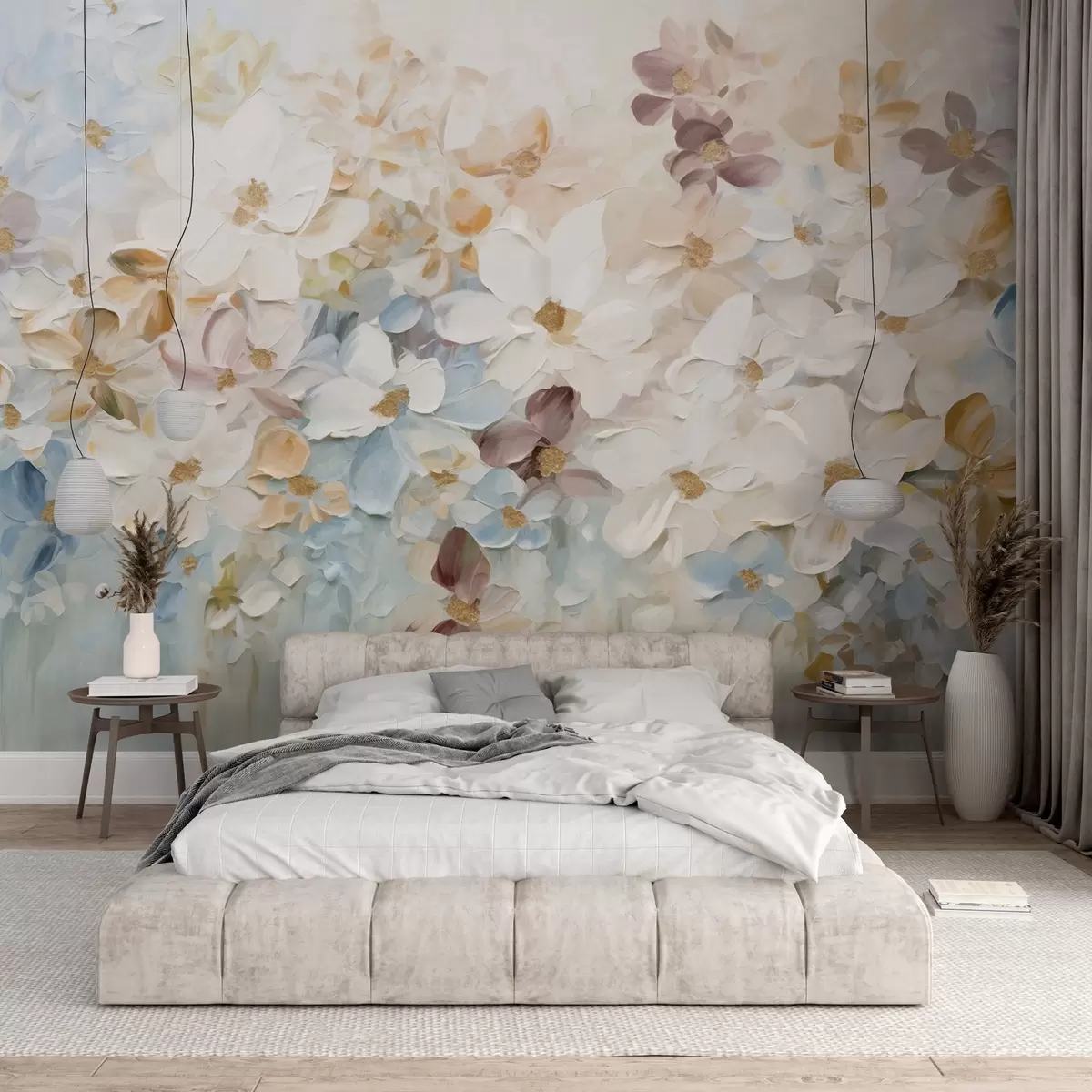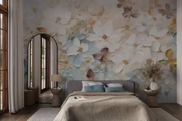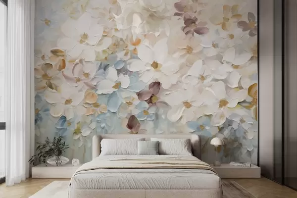 Murais de parede Pintura a óleo imitação de um jardim de flores com flores brancas, azuis e cor de laranja, pinceladas suaves, cores pastel suaves Nr. w09236v1