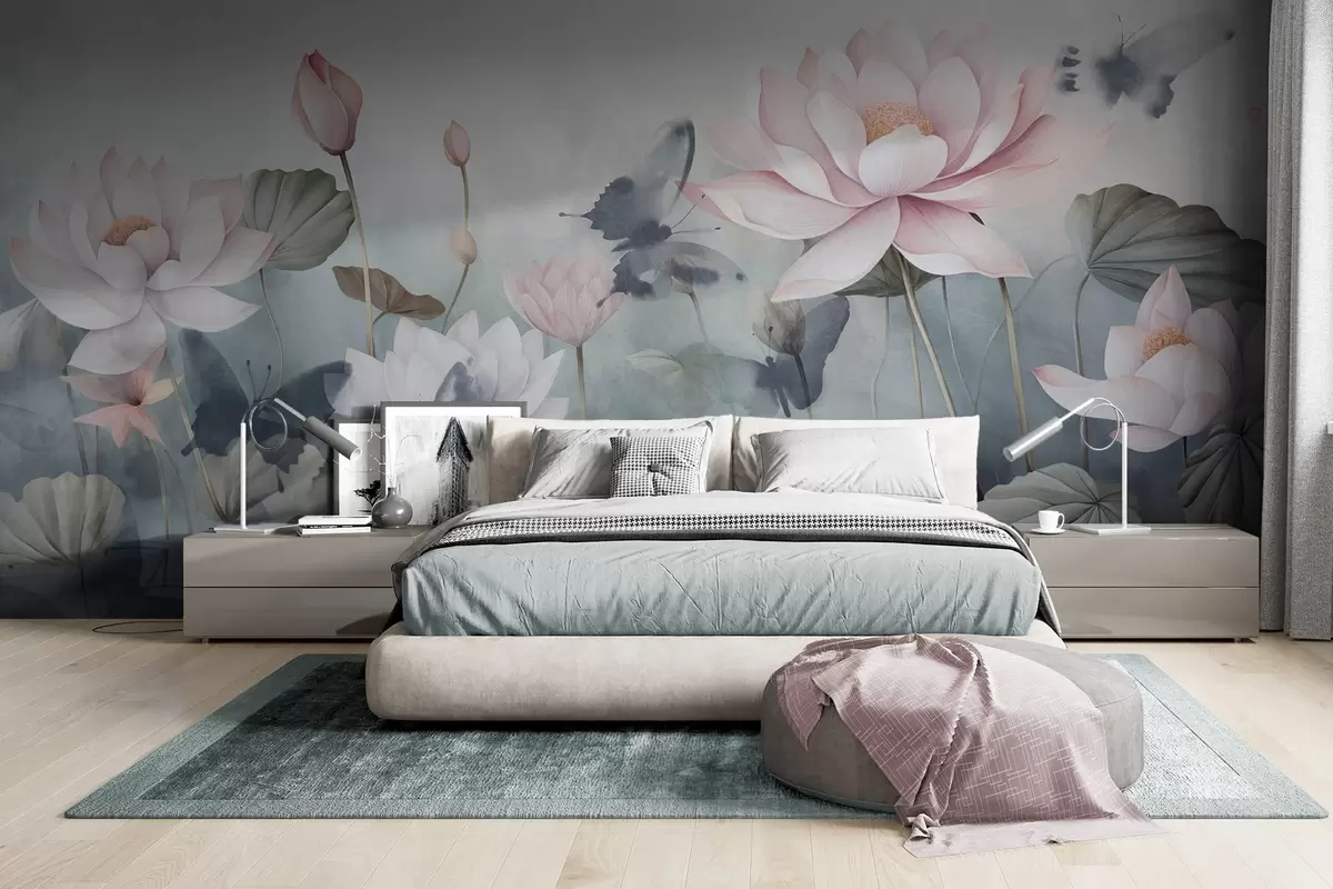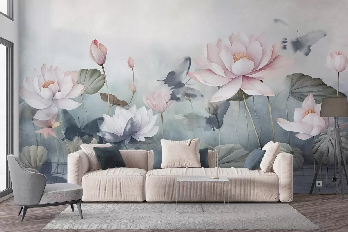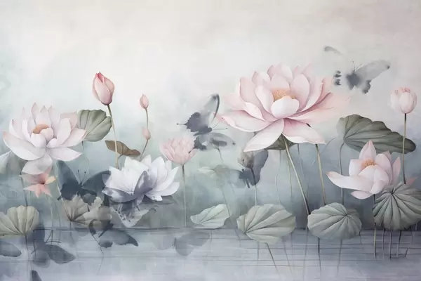 Murais de parede Flores texturizadas de lótus com pétalas cor-de-rosa pastel, folhas verdes, reflexo da água, cores pastel suaves, efeito aguarela Nr. w09254