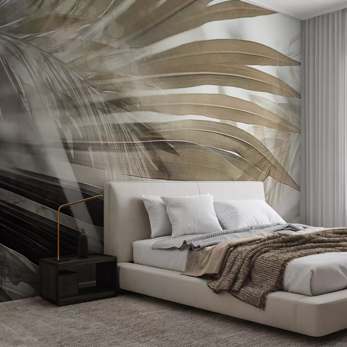Murais de parede Folhas de palmeira com uma tonalidade castanha clara, sobrepostas e criando um efeito de camadas, sobre um fundo suave e neutro Nr. w09256
