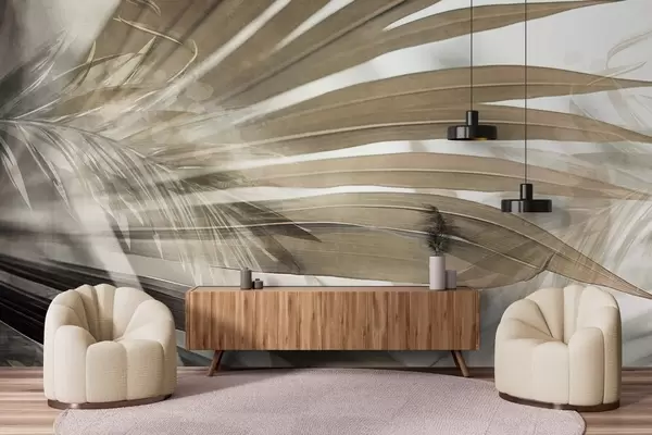 Murais de parede Folhas de palmeira com uma tonalidade castanha clara, sobrepostas e criando um efeito de camadas, sobre um fundo suave e neutro Nr. w09256