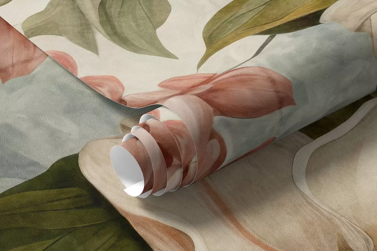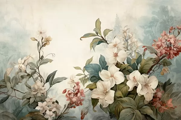 Murais de parede Flores e folhas tropicais texturadas com tons suaves de azul e verde, pinceladas delicadas, estilo botânico vintage Nr. w09259