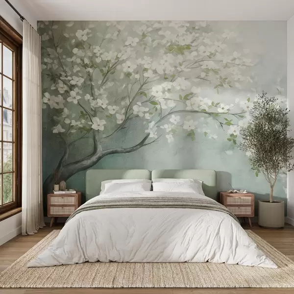 Murais de parede Uma árvore florida com flores brancas em plena floração, sobre um fundo granulado com textura ruidosa de azul e verde suaves Nr. w09261