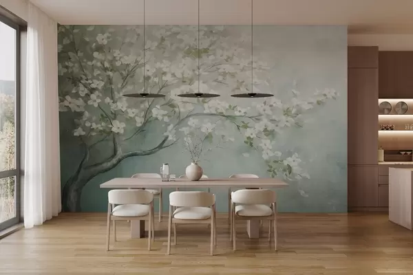 murais de parede Uma árvore florida com flores brancas em plena floração, sobre um fundo granulado com textura ruidosa de azul e verde suaves w09261