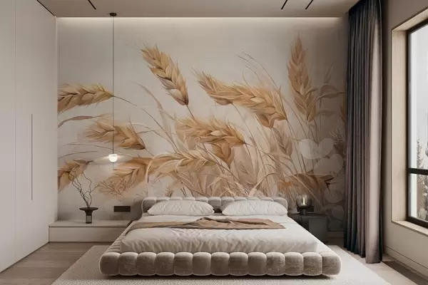Murais de parede Campo de trigo texturizado com espigas de cereal bege balançando ao vento, cores suaves e discretas, criando uma sensação de calor Nr. w09264