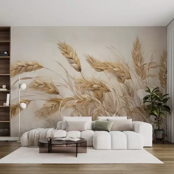 Murais de parede Campo de trigo texturizado com espigas de cereal bege balançando ao vento, cores suaves e discretas, criando uma sensação de calor Nr. w09264