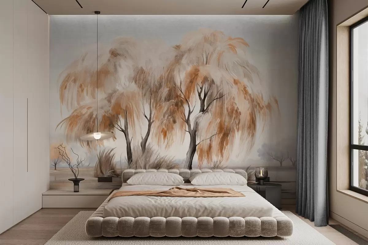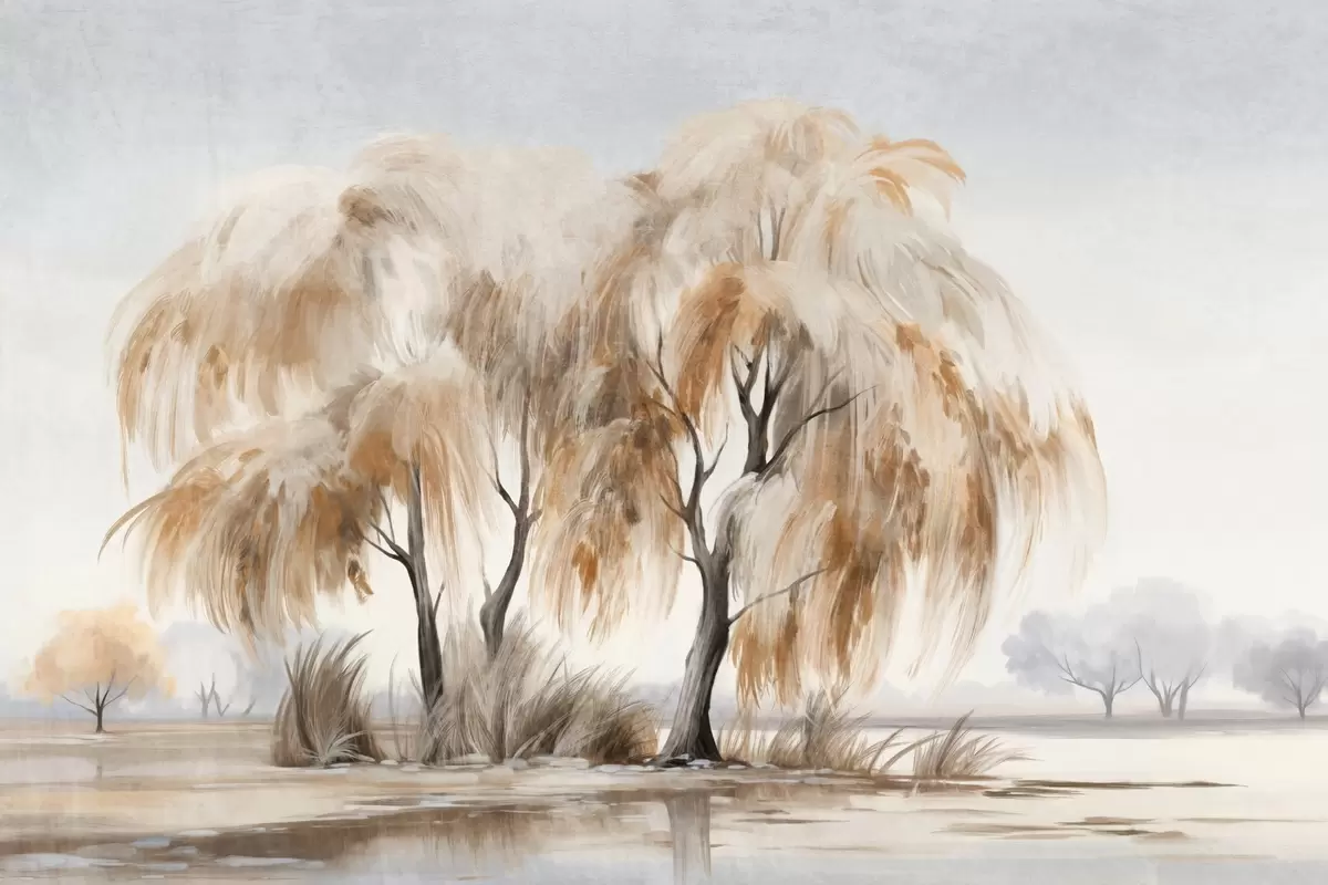 Murais de parede Salgueiros texturizados com folhas castanhas e brancas na margem de um lago, com alguma relva à volta, num dia enevoado Nr. w09268