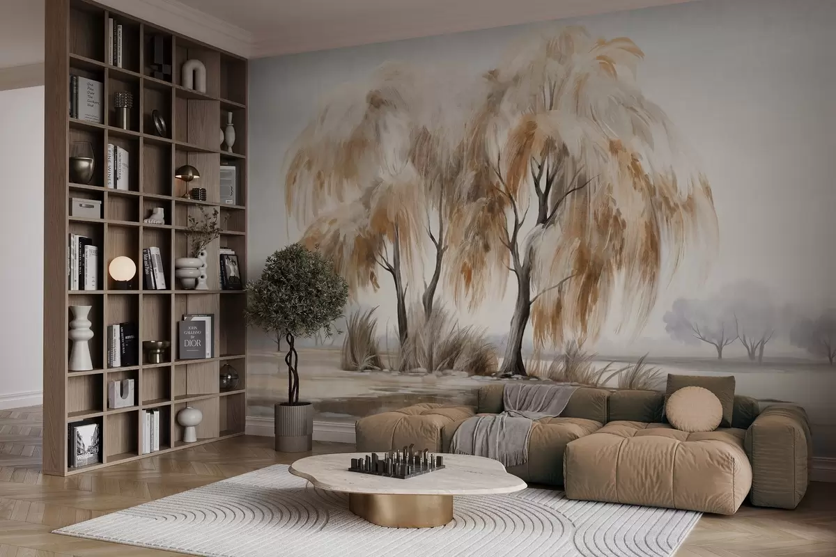 murais de parede Salgueiros texturizados com folhas castanhas e brancas na margem de um lago, com alguma relva à volta, num dia enevoado w09268