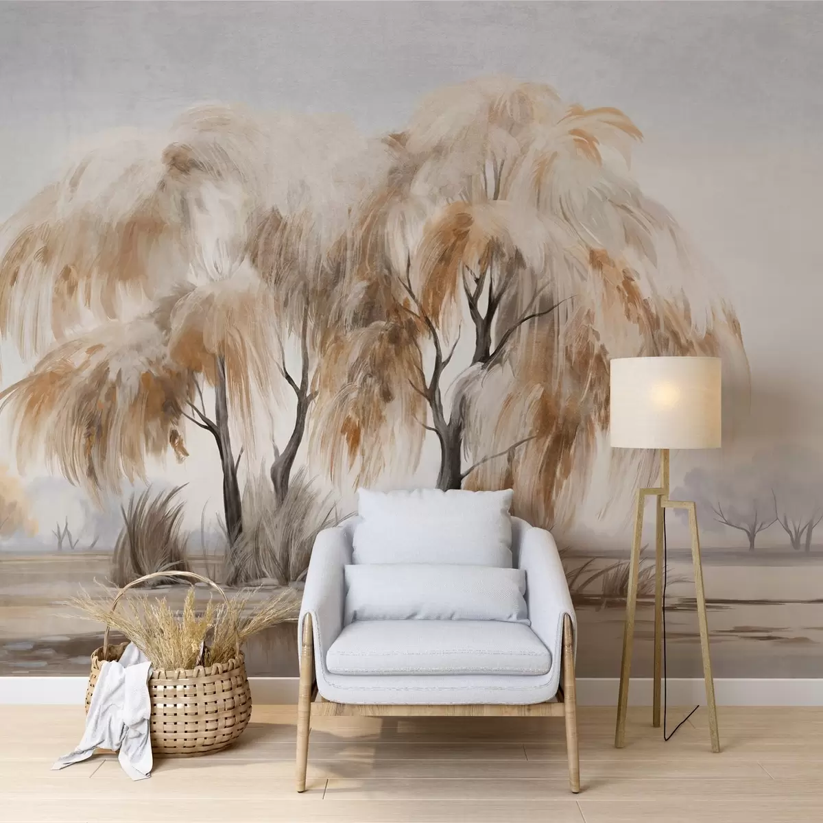 Murais de parede Salgueiros texturizados com folhas castanhas e brancas na margem de um lago, com alguma relva à volta, num dia enevoado Nr. w09268