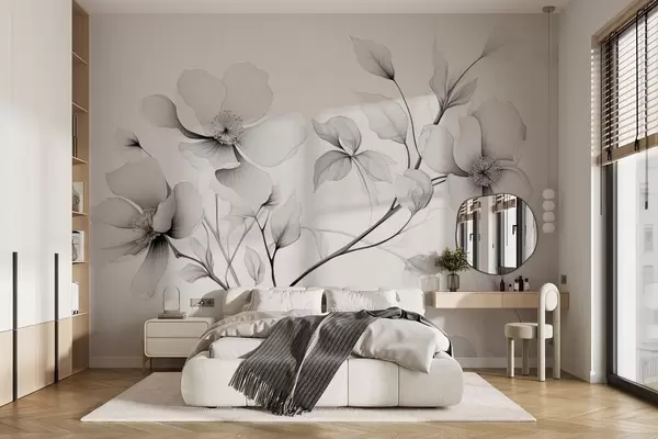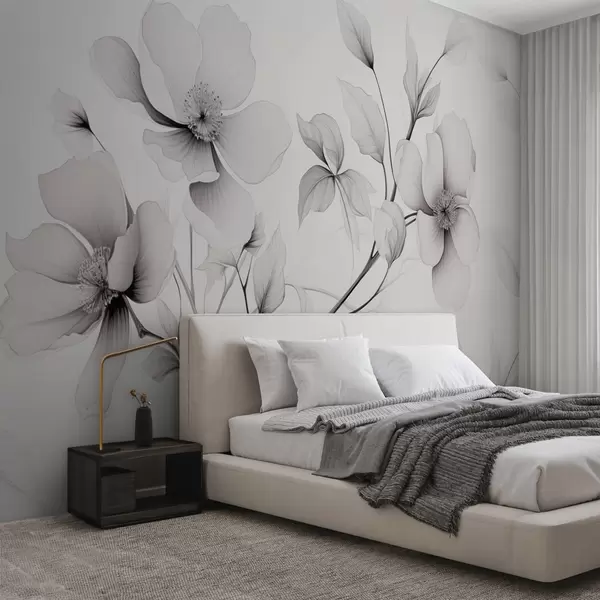 Murais de parede Flores pretas e brancas com linhas elegantes sobre um fundo cinzento Nr. w09271