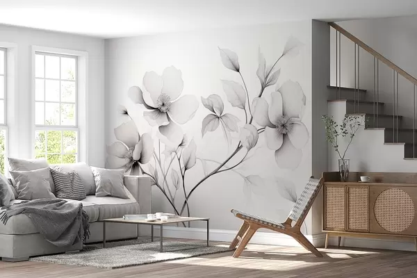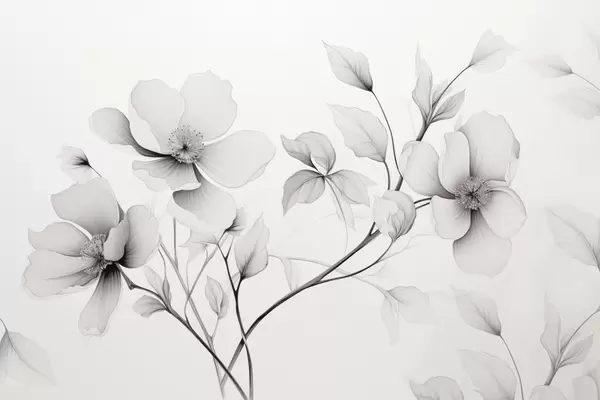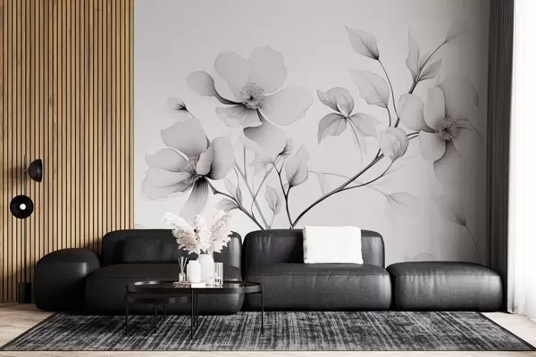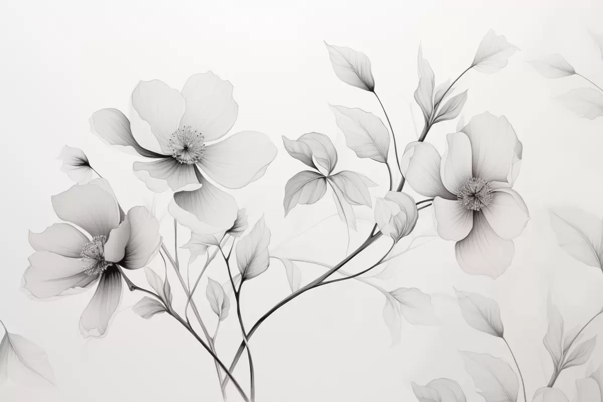 Murais de parede Flores pretas e brancas com linhas elegantes sobre um fundo cinzento Nr. w09271