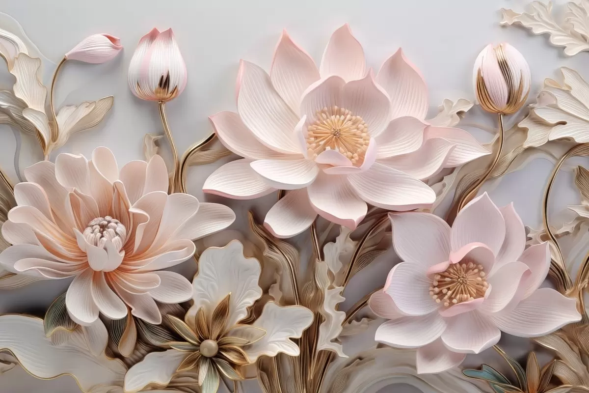 Murais de parede Flores volumétricas cor-de-rosa com folhas amarelas Nr. w09277
