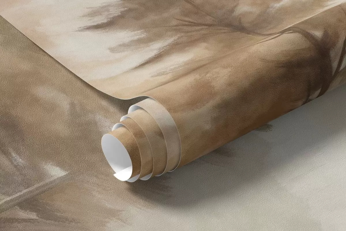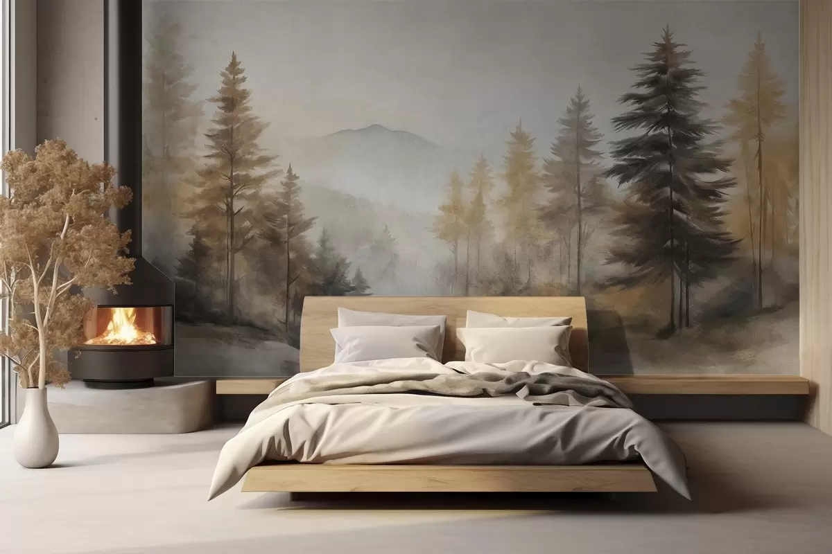Murais de parede Floresta de outono texturizada com pinheiros altos e montanhas no fundo, as cores são suaves e terrosas estilo de pintura Nr. w09290