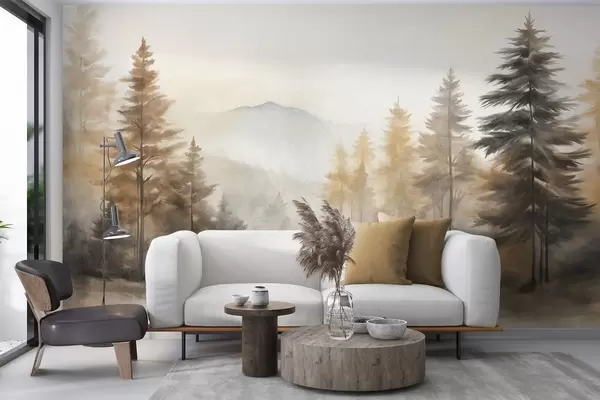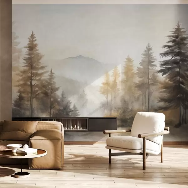 Murais de parede Floresta de outono texturizada com pinheiros altos e montanhas no fundo, as cores são suaves e terrosas estilo de pintura Nr. w09290