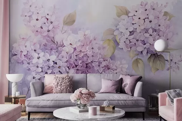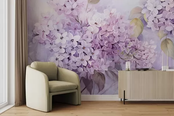 Murais de parede Flores lilás texturadas com pétalas roxas claras, folhas verdes claras, estilo aguarela, cores suaves e pastel, pinceladas delicadas Nr. w09291