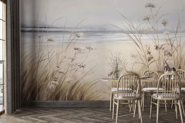 Murais de parede Um campo de trigo com flores brancas em primeiro plano, uma praia e o oceano em segundo plano, cores pastel neutras e suaves Nr. w09298