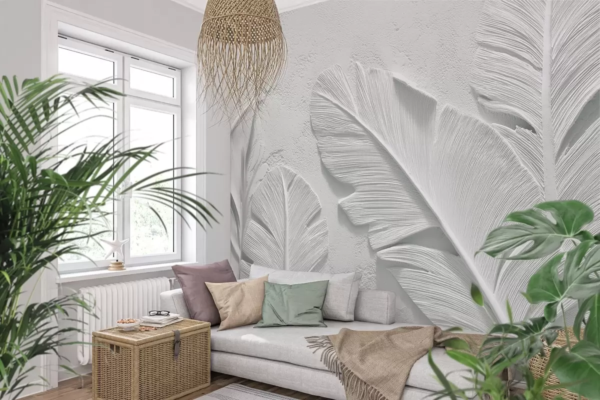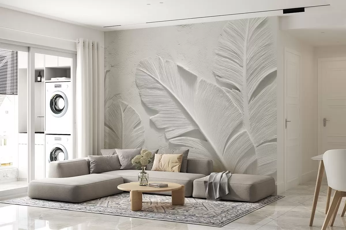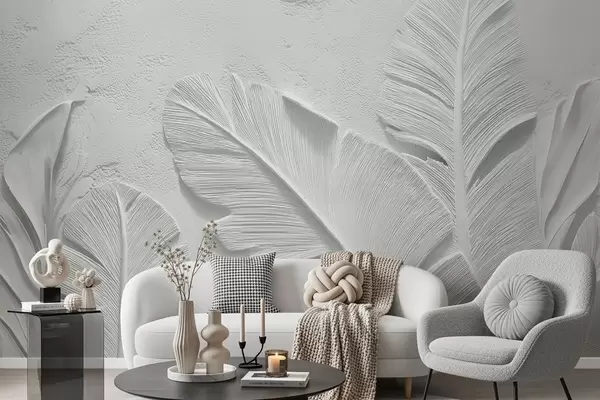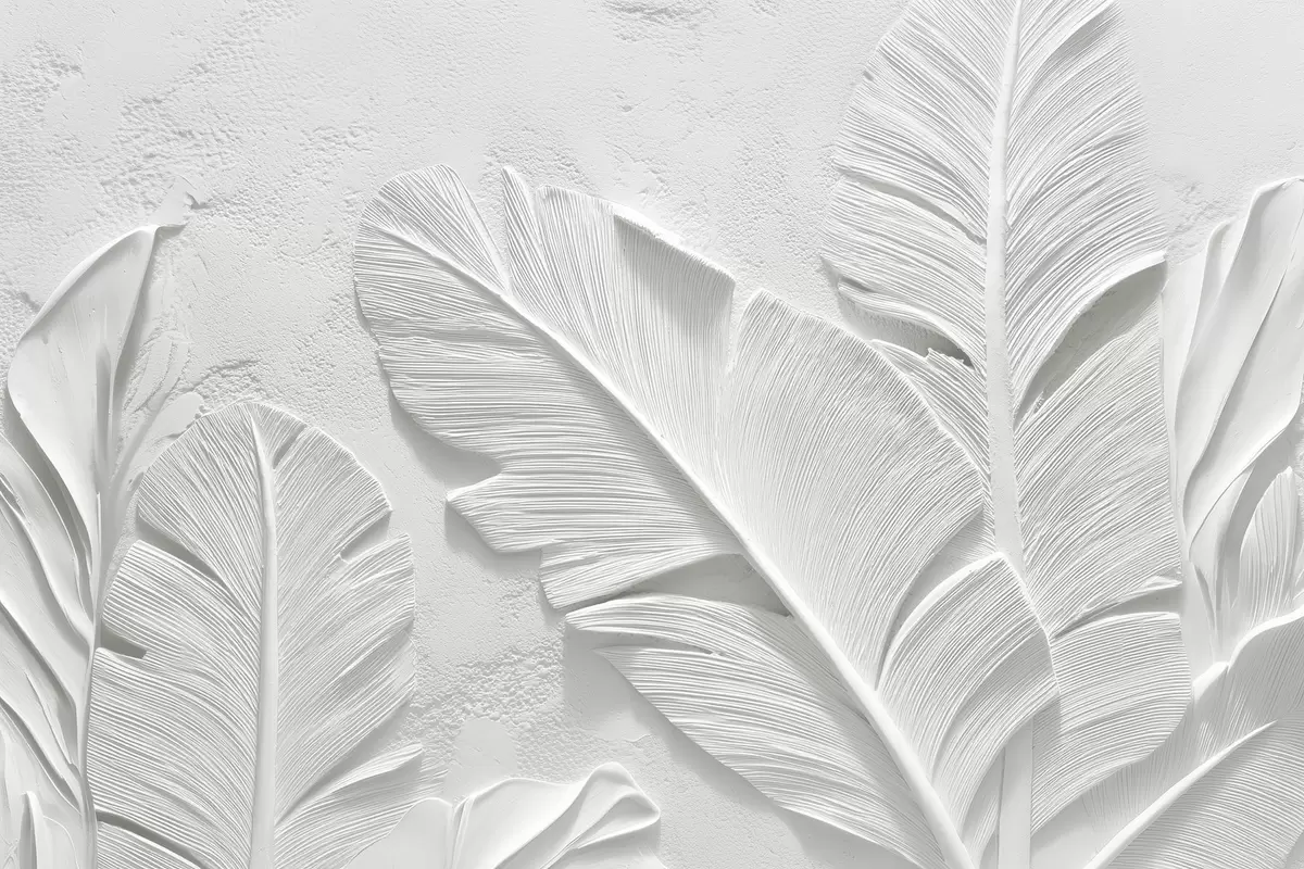 Murais de parede Folhas cinzentas texturizadas sobre um fundo com falso relevo de gesso Nr. w09307