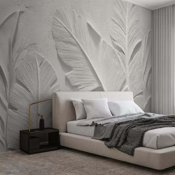 Murais de parede Folhas cinzentas texturizadas sobre um fundo com falso relevo de gesso Nr. w09307