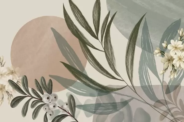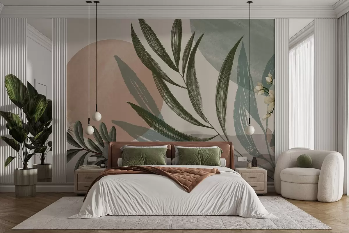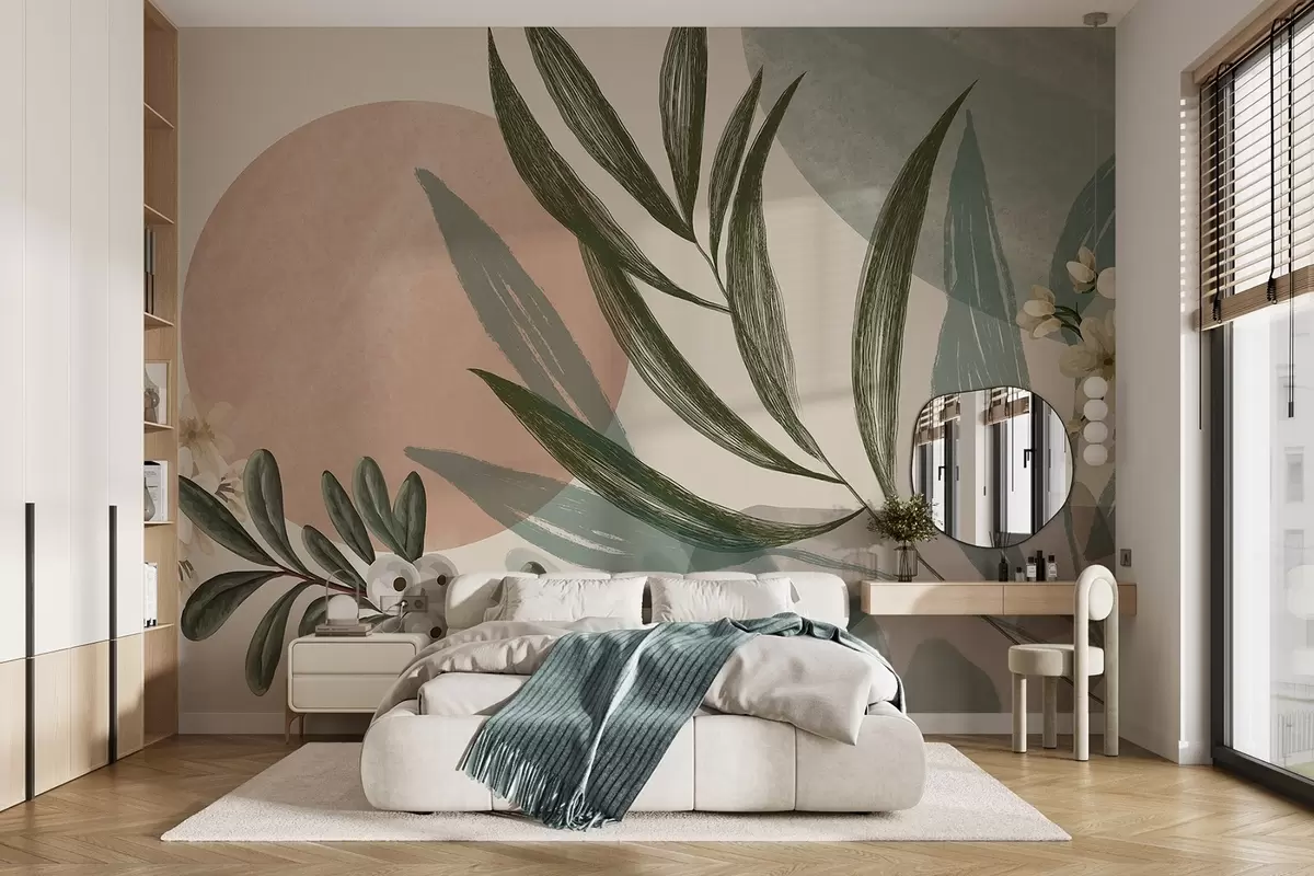 Murais de parede Arte botânica abstrata com folhas de palmeira verdes e bagas brancas, sobre um fundo de formas em tons de terra suaves Nr. w09312