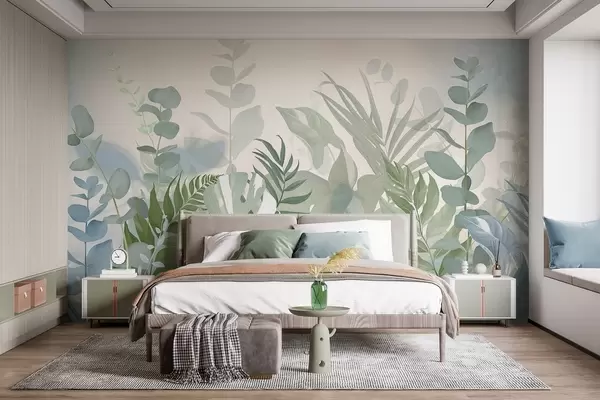 Murais de parede Plantas verdes pastel, fetos, monstera e eucalipto, fundo com textura clara, iluminação suave, tranquilidade, ilustração botânica Nr. w09316