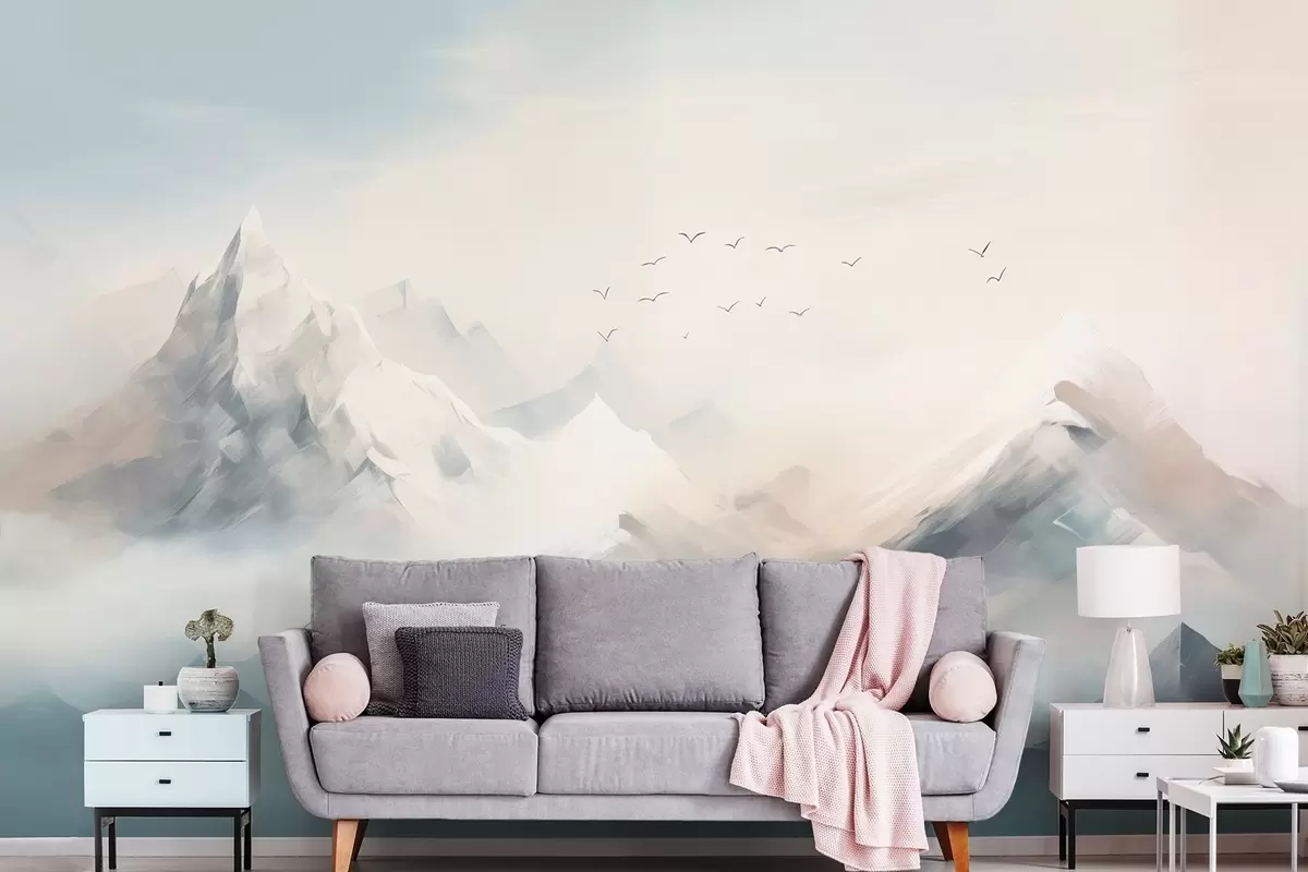 Murais de parede Picos de montanhas cobertos de neve no nevoeiro matinal com pássaros a voar Nr. w09326
