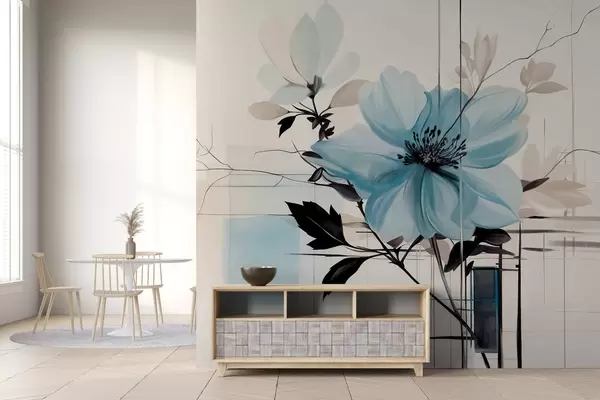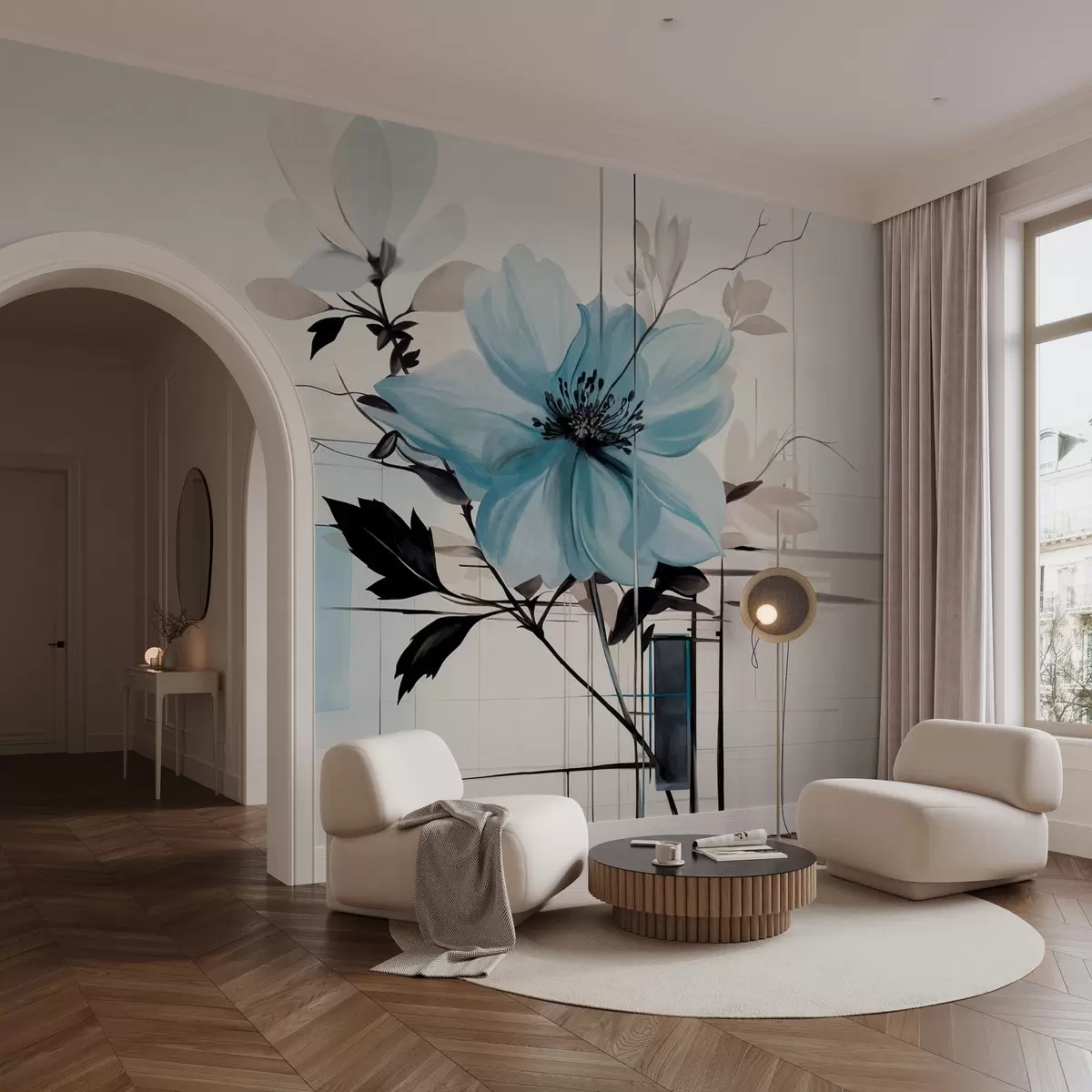 Murais de parede Flor azul abstrata texturada com folhas e ramos escuros, formas geométricas minimalistas e linhas em cores suaves Nr. w09332