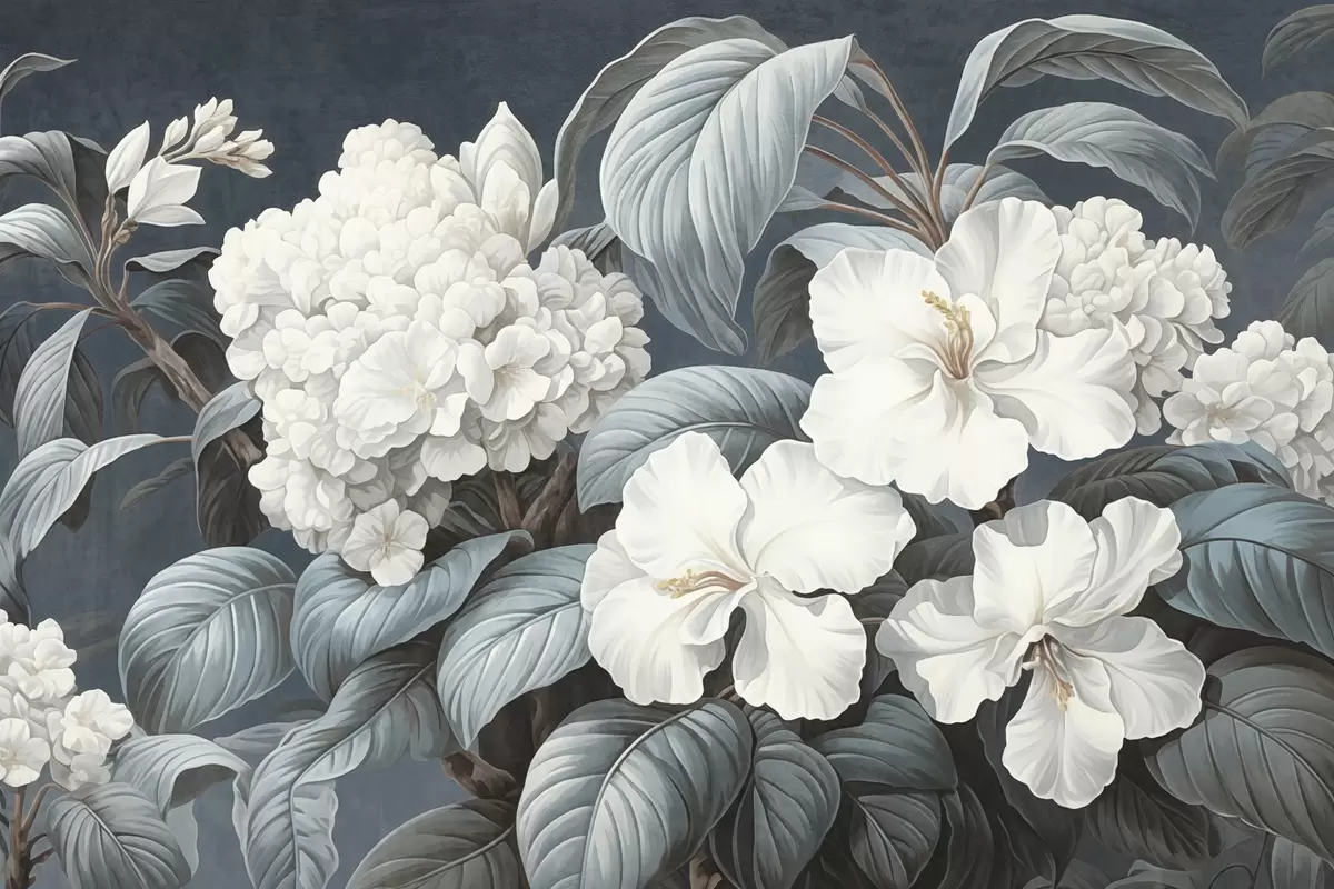 Murais de parede Flores tropicais brancas com pétalas e folhas delicadas num fundo azul escuro, estilo vintage texturado, ilustração botânica Nr. w09334