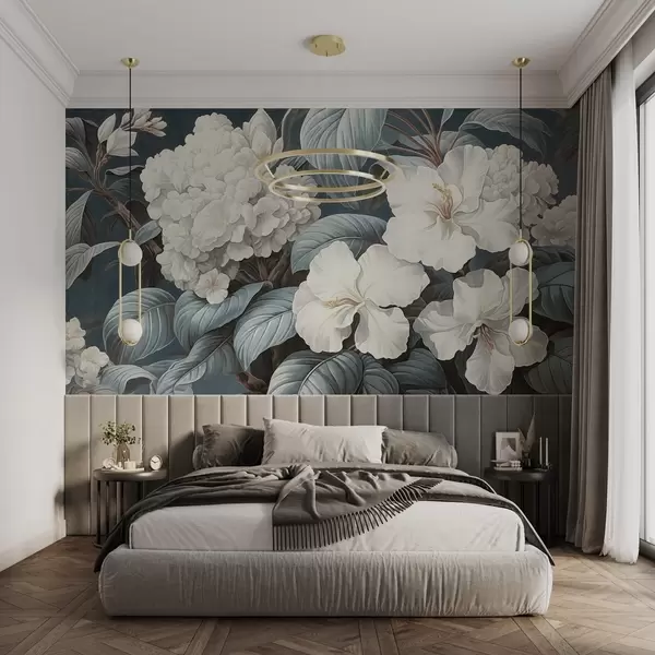 Murais de parede Flores tropicais brancas com pétalas e folhas delicadas num fundo azul escuro, estilo vintage texturado, ilustração botânica Nr. w09334