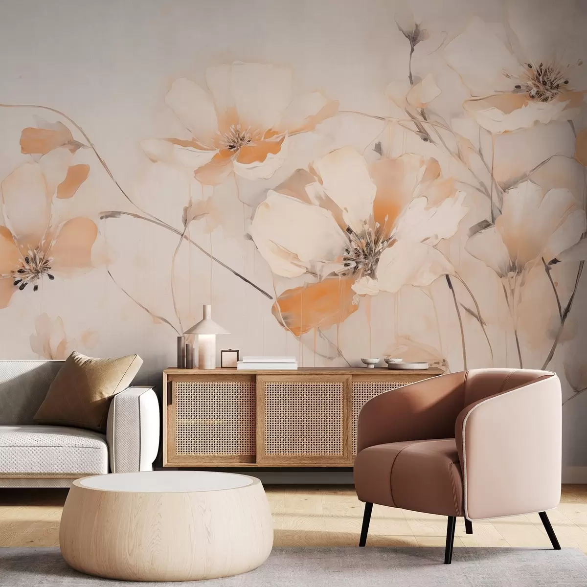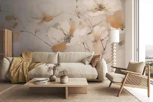 Murais de parede Flores brancas e cor de laranja texturizadas com caules longos, fundo claro, cores suaves, composição elegante, pinceladas delicadas Nr. w09335