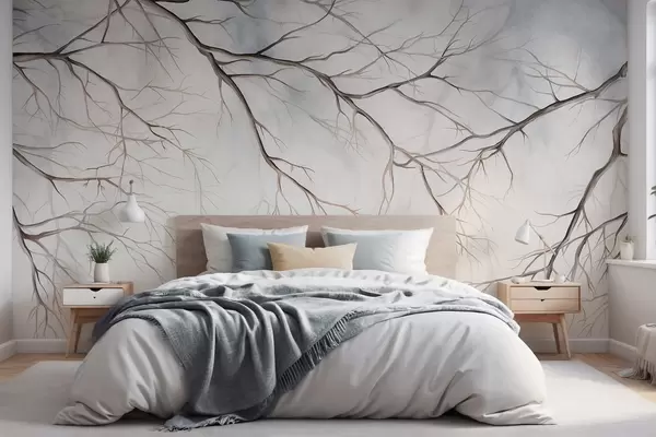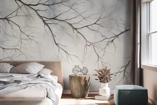 Murais de parede Ramos de árvores com um efeito texturado de aguarela, pormenores intrincados, paleta de cores suaves, sobre um fundo claro Nr. w09337
