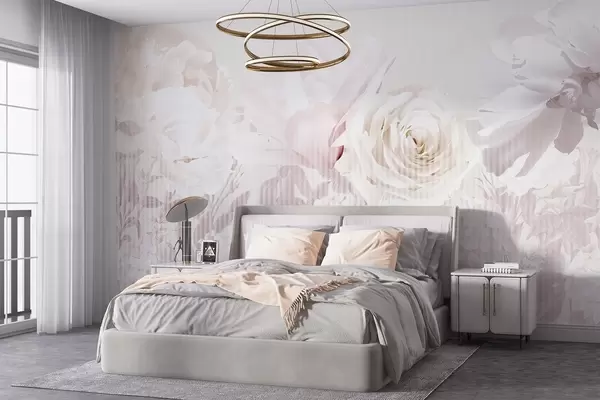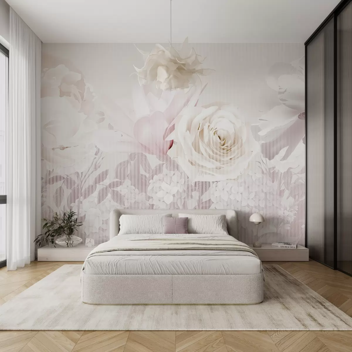 Murais de parede Arranjo floral com rosas, hortênsias e tulipas em tons pastel suaves de branco, rosa e bege, com textura às riscas Nr. w09340