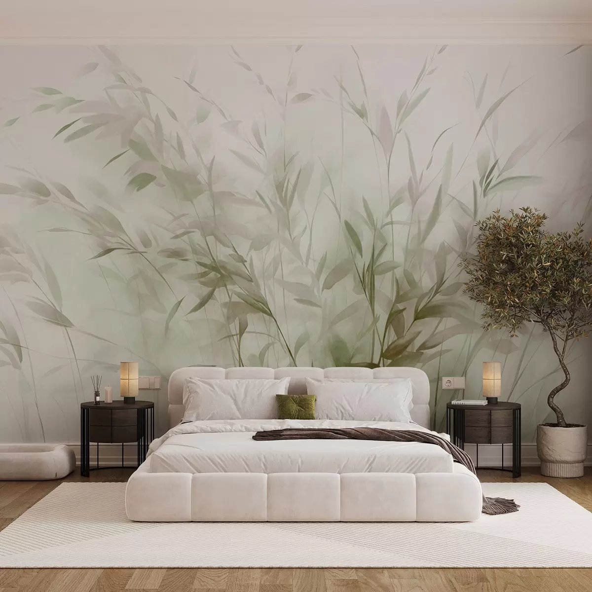 Murais de parede Relva e ervas daninhas com folhas e caules finos, cores verde-claro e castanho, pinceladas suaves e delicadas, impressão minimalista Nr. w09342