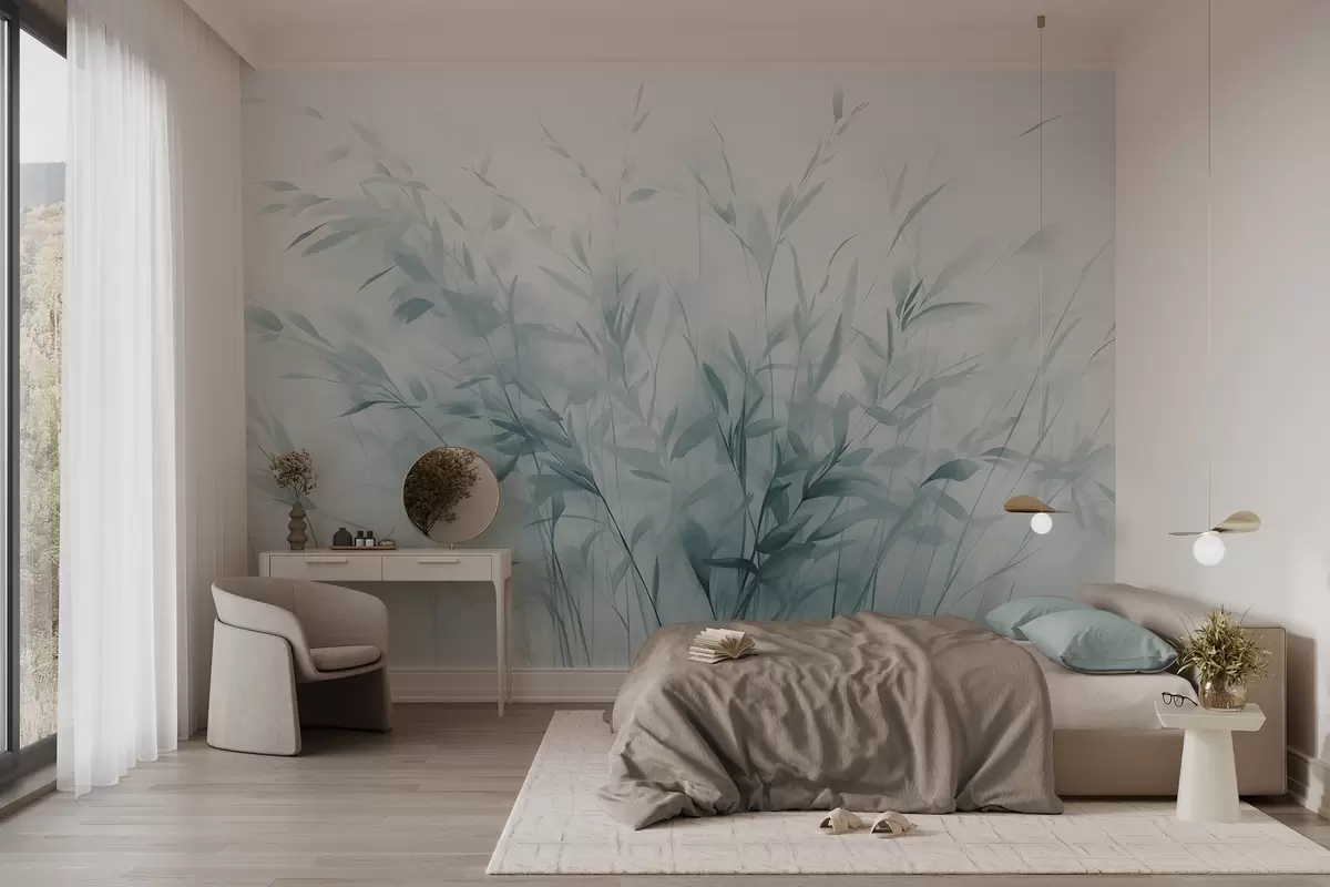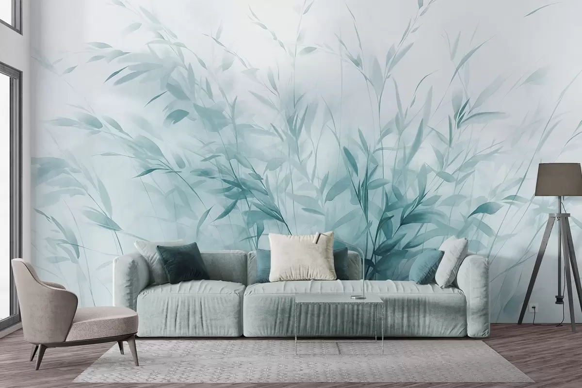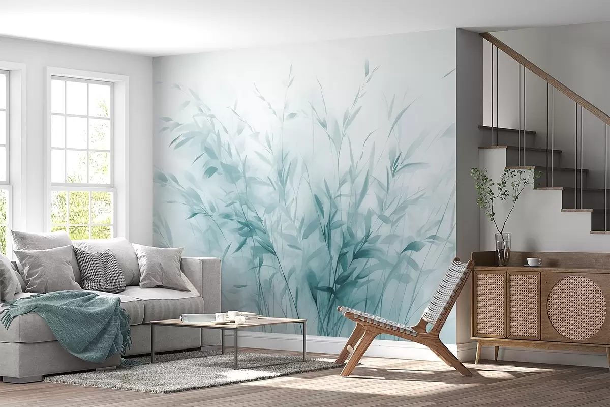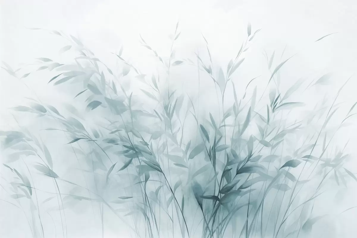 Murais de parede Relva e ervas daninhas com folhas e caules finos, cores azuis claras, pinceladas suaves e delicadas, impressão minimalista Nr. w09342v1