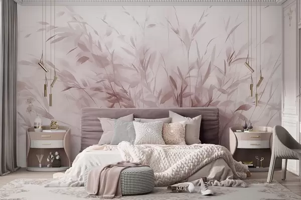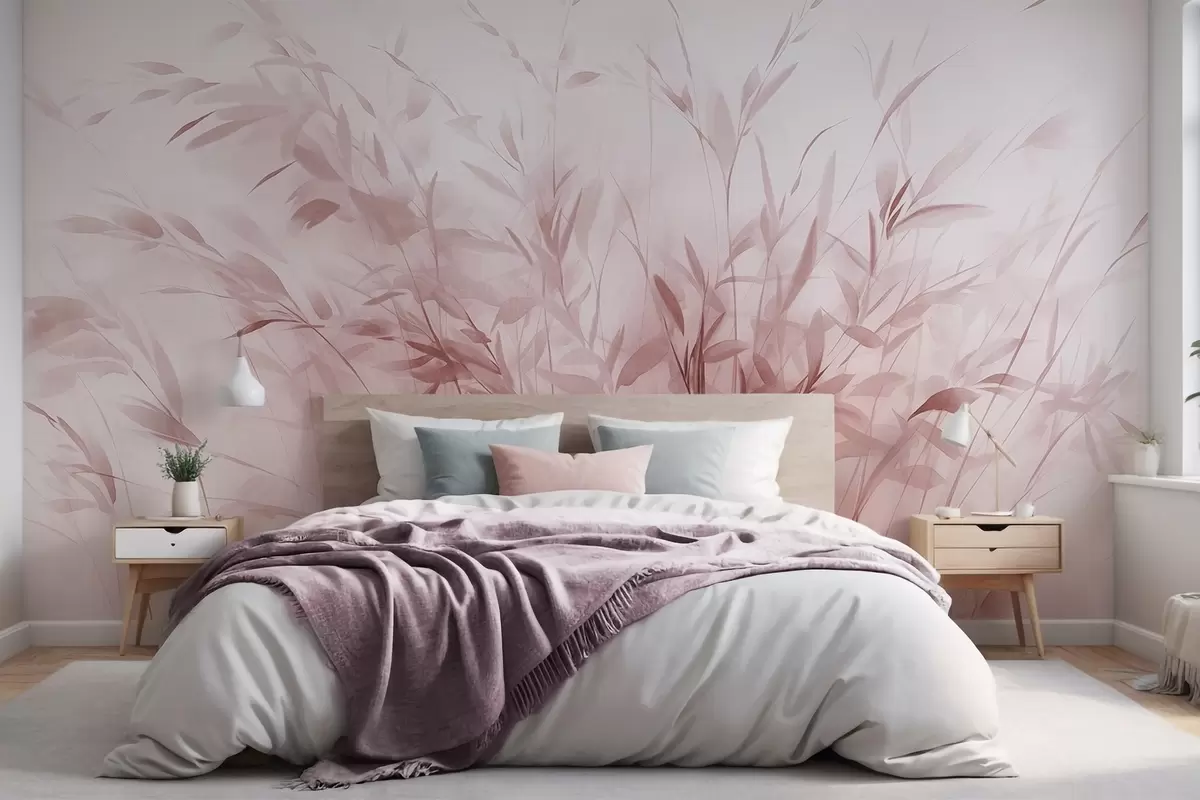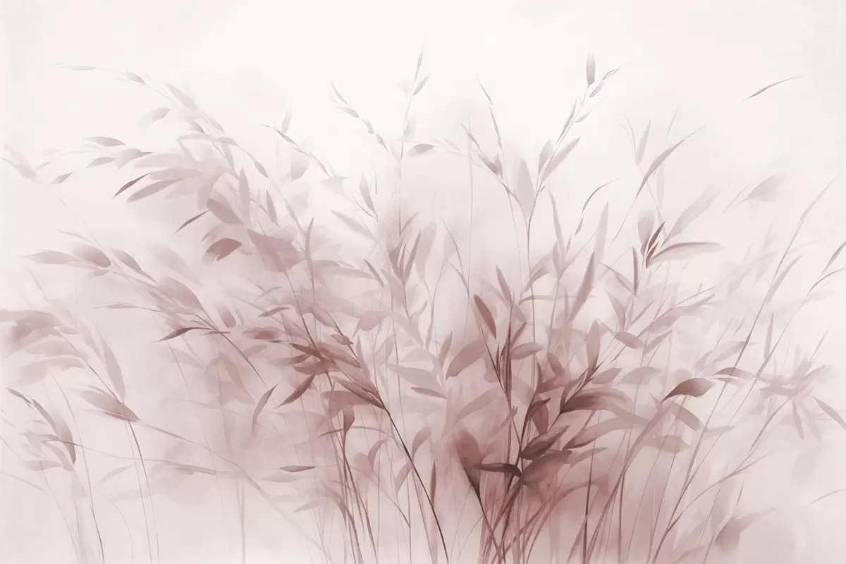 Murais de parede Relva e ervas daninhas com folhas e caules finos, cores rosa claro, pinceladas suaves e delicadas, impressão minimalista Nr. w09342v2