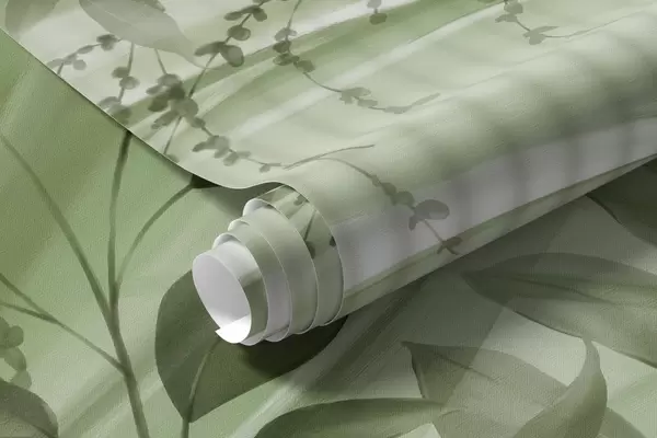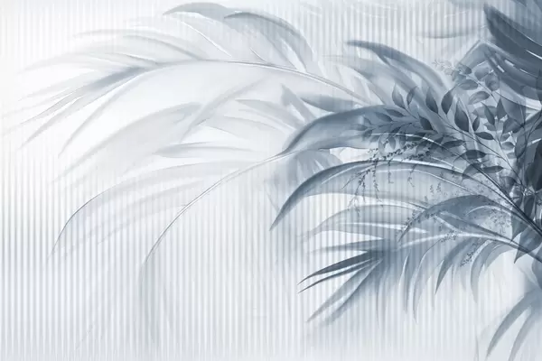 Murais de parede Folhas verdes de palmeiras tropicais com um fundo branco às riscas, iluminação suave, pinceladas delicadas, formas orgânicas Nr. w09343
