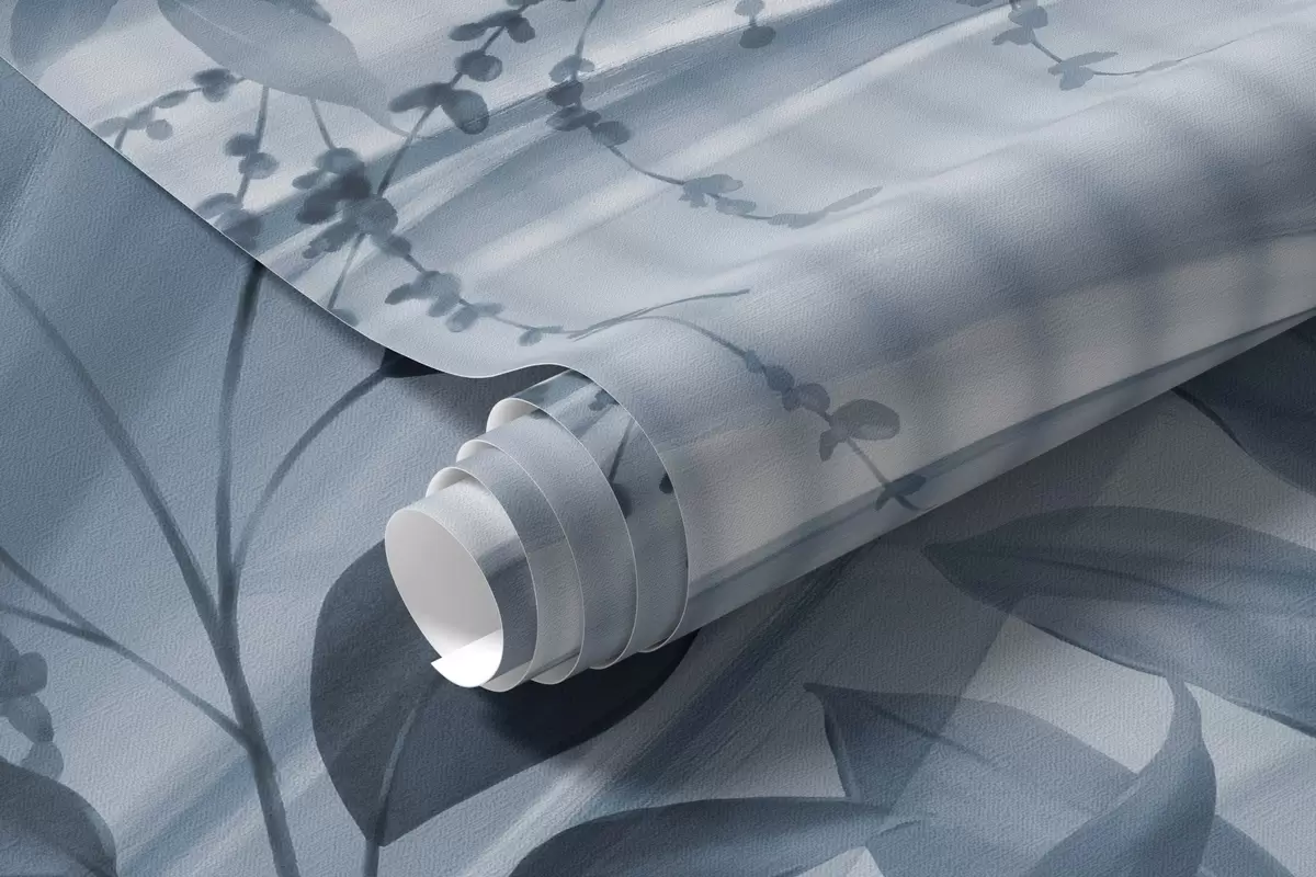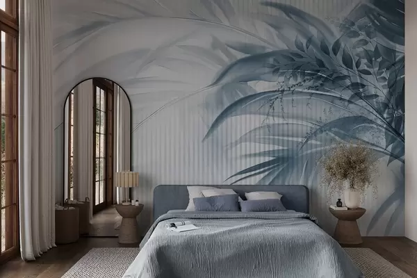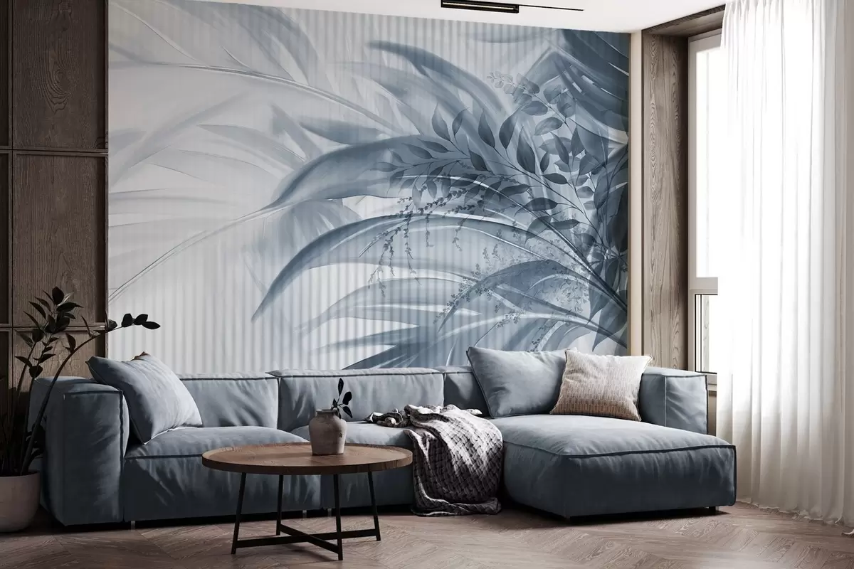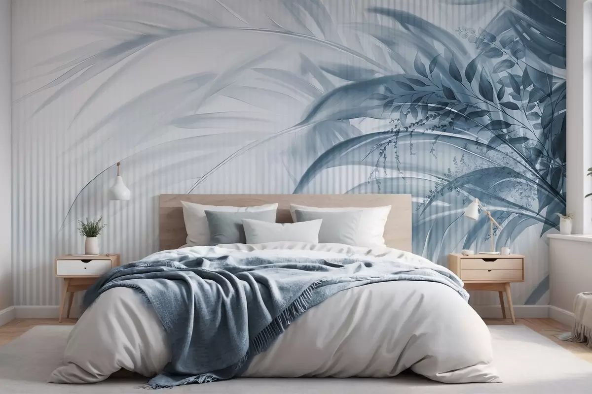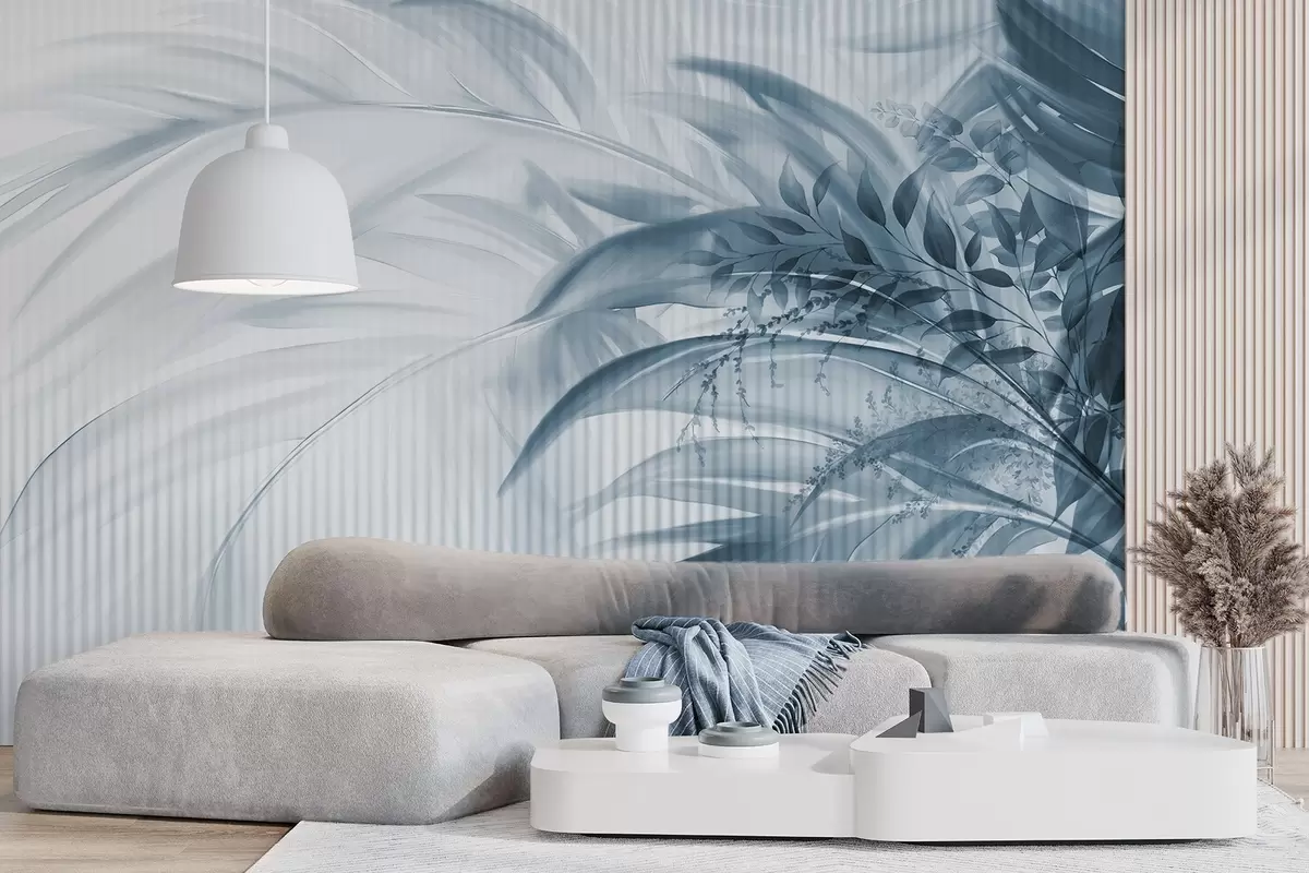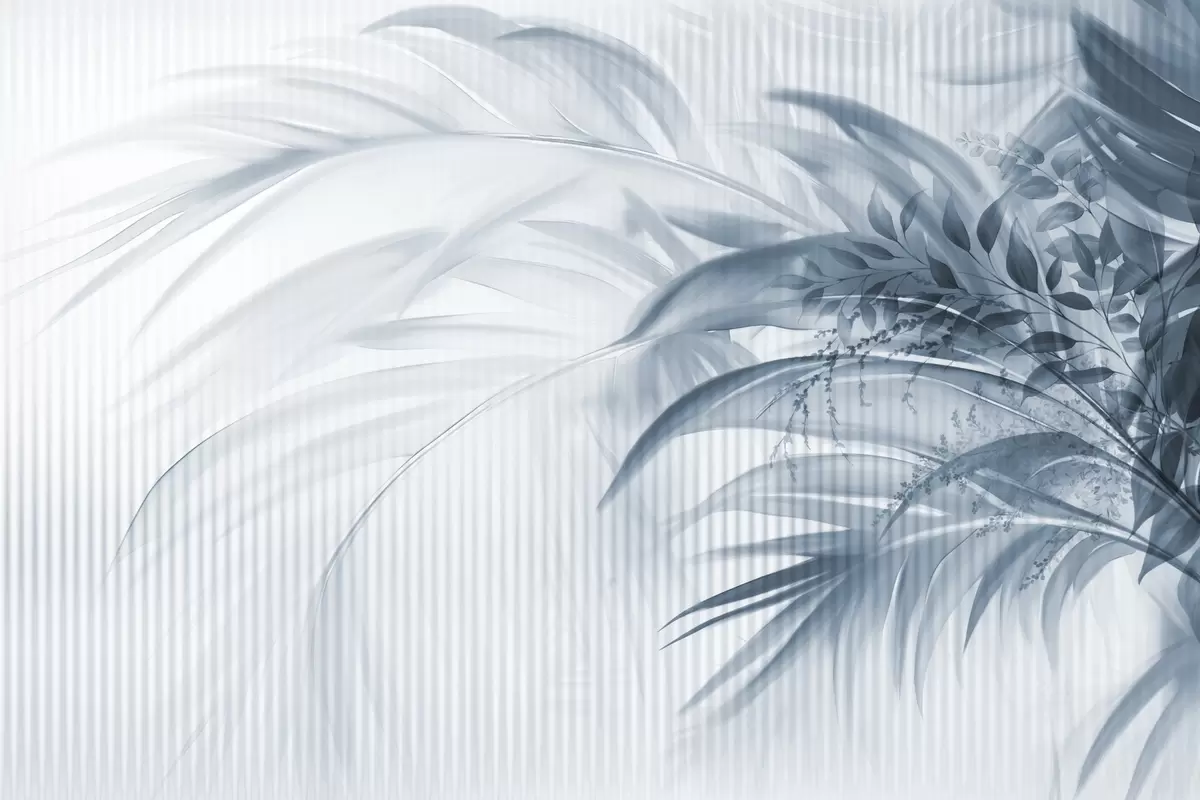 Murais de parede Folhas azuis de palmeira tropical com um fundo branco às riscas, iluminação suave, pinceladas delicadas, formas orgânicas Nr. w09343v1