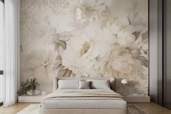 Murais de parede Um arranjo floral de peónias brancas com folhas bege, sobre um fundo decorativo com uma textura vintage Nr. w09345